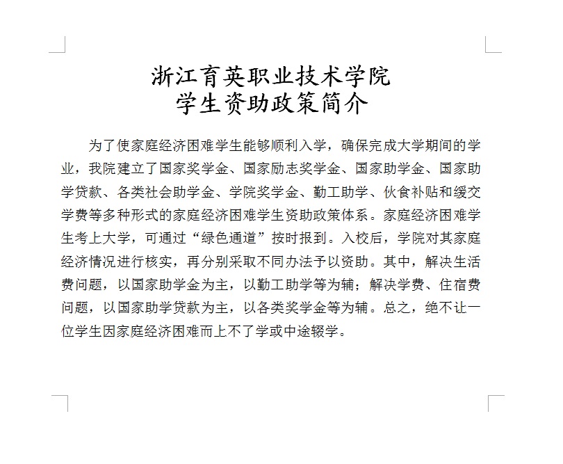 招生咨询 招生公告 报考指南 提前招生 历年分数 2025年招生专栏 录取查询 在线咨询 联系我们 地址:杭州市钱塘区4号大街16号 邮编:310018 电话:0571-86911032、86877189 报考指南 当前位置:首页 >> 招生咨询 >> 报考指南 我院2017年学生资助政策 时间:2017-06-20
