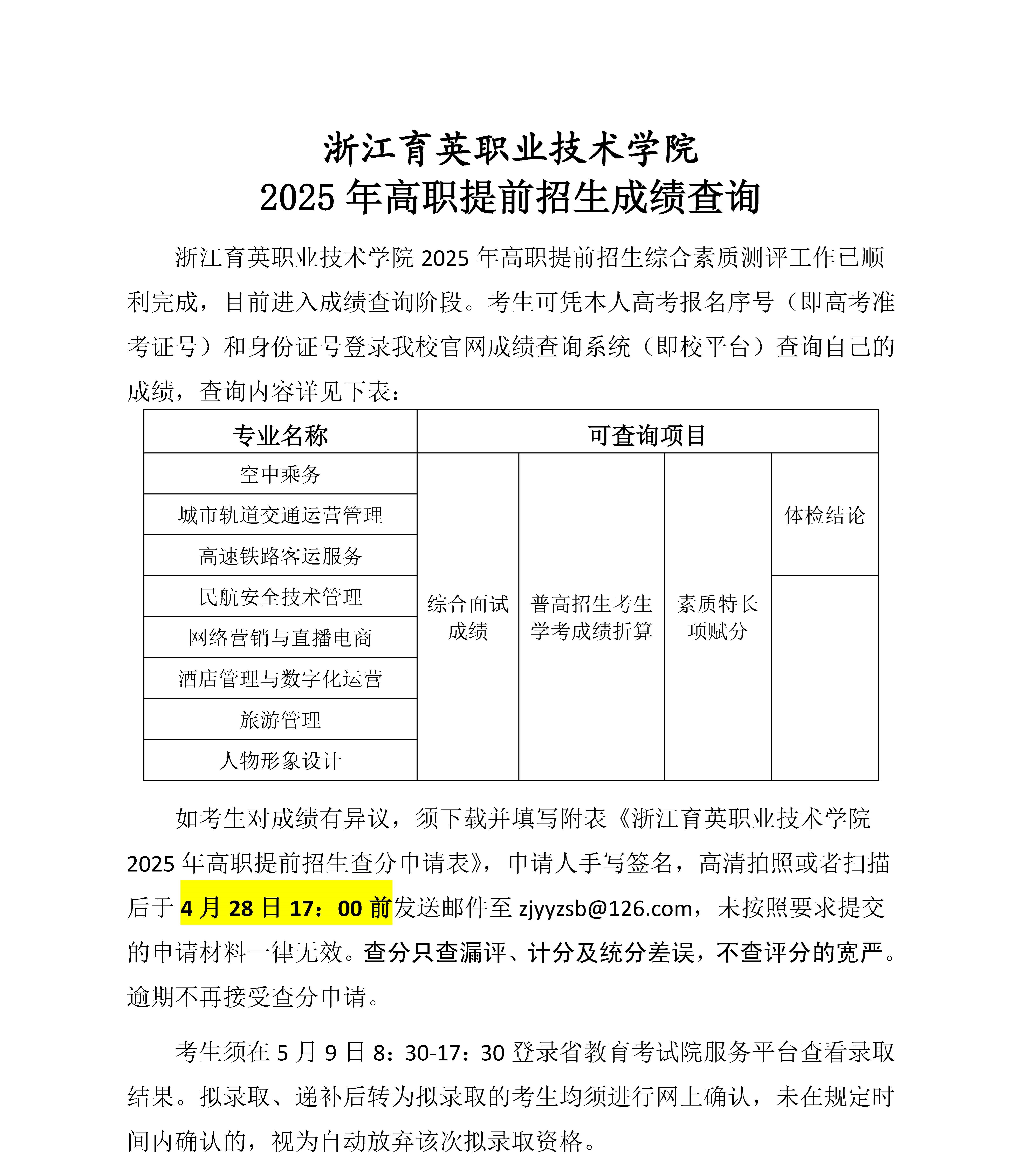 招生咨询 招生公告 报考指南 提前招生 历年分数 2025年招生专栏 录取查询 在线咨询 联系我们 地址:杭州市钱塘区4号大街16号 邮编:310018 电话:0571-86911032、86877189 招生公告 当前位置:首页 >> 招生咨询 >> 招生公告 浙江育英职业技术学院2025年高职提前招生成绩查询 时间:2025-04-25 点击进入:校平台 点击下载:浙江育英职业技术学院2025年高职提前招生查分申请表