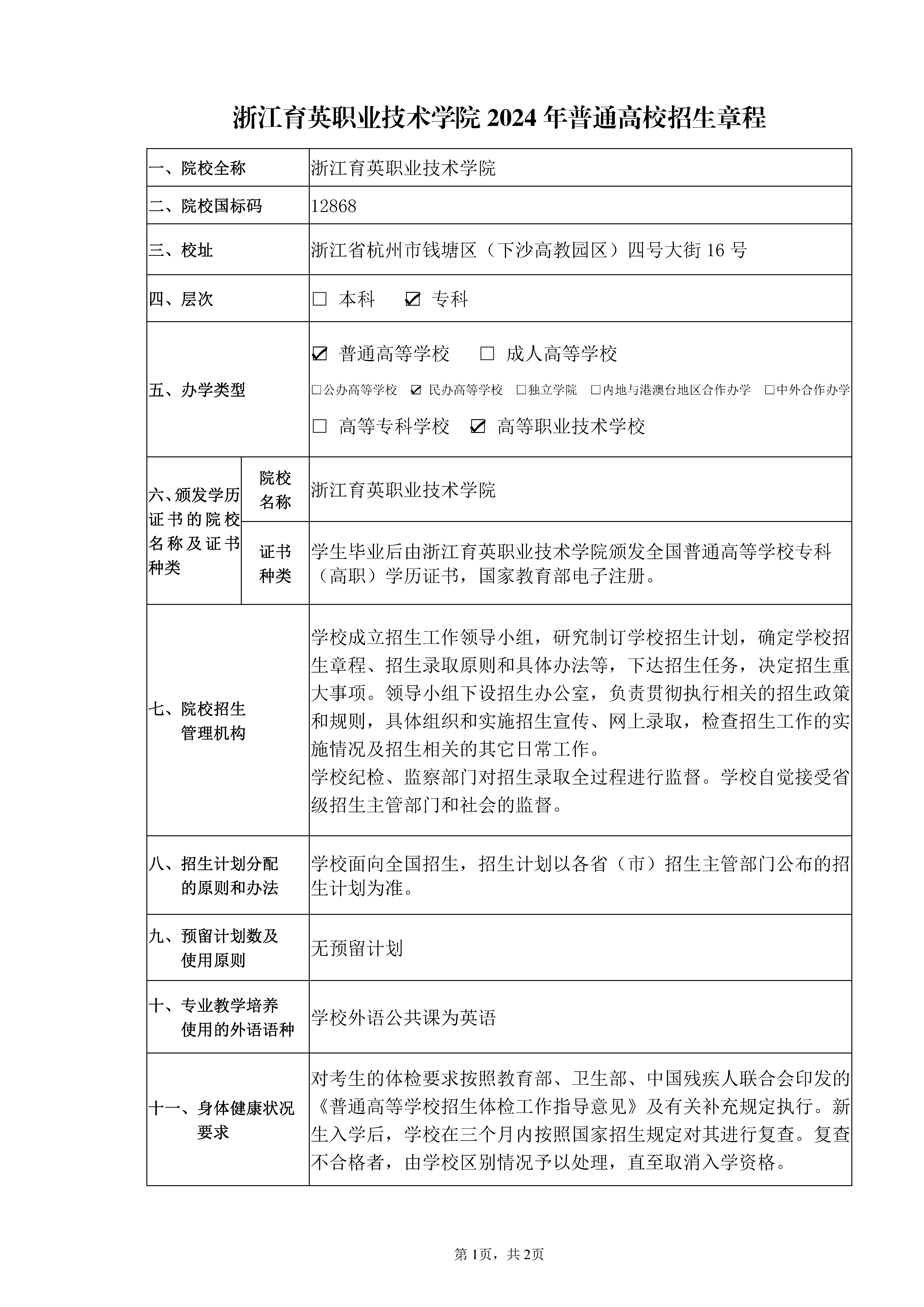 招生咨询 招生公告 报考指南 提前招生 历年分数 2025年招生专栏 录取查询 在线咨询 联系我们 地址:杭州市钱塘区4号大街16号 邮编:310018 电话:0571-86911032、86877189 招生公告 当前位置:首页 >> 招生咨询 >> 招生公告 浙江育英职业技术学院2024 年普通高校招生章程 时间:2024-05-17