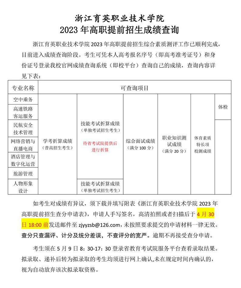 招生咨询 招生公告 报考指南 提前招生 历年分数 2025年招生专栏 录取查询 在线咨询 联系我们 地址:杭州市钱塘区4号大街16号 邮编:310018 电话:0571-86911032、86877189 招生公告 当前位置:首页 >> 招生咨询 >> 招生公告 浙江育英职业技术学院2023年高职提前招生成绩查询 时间:2023-04-27 点击进入:成绩查询系统(校平台) 附表:浙江育英职业技术学院2023年高职提前招生查分申请表