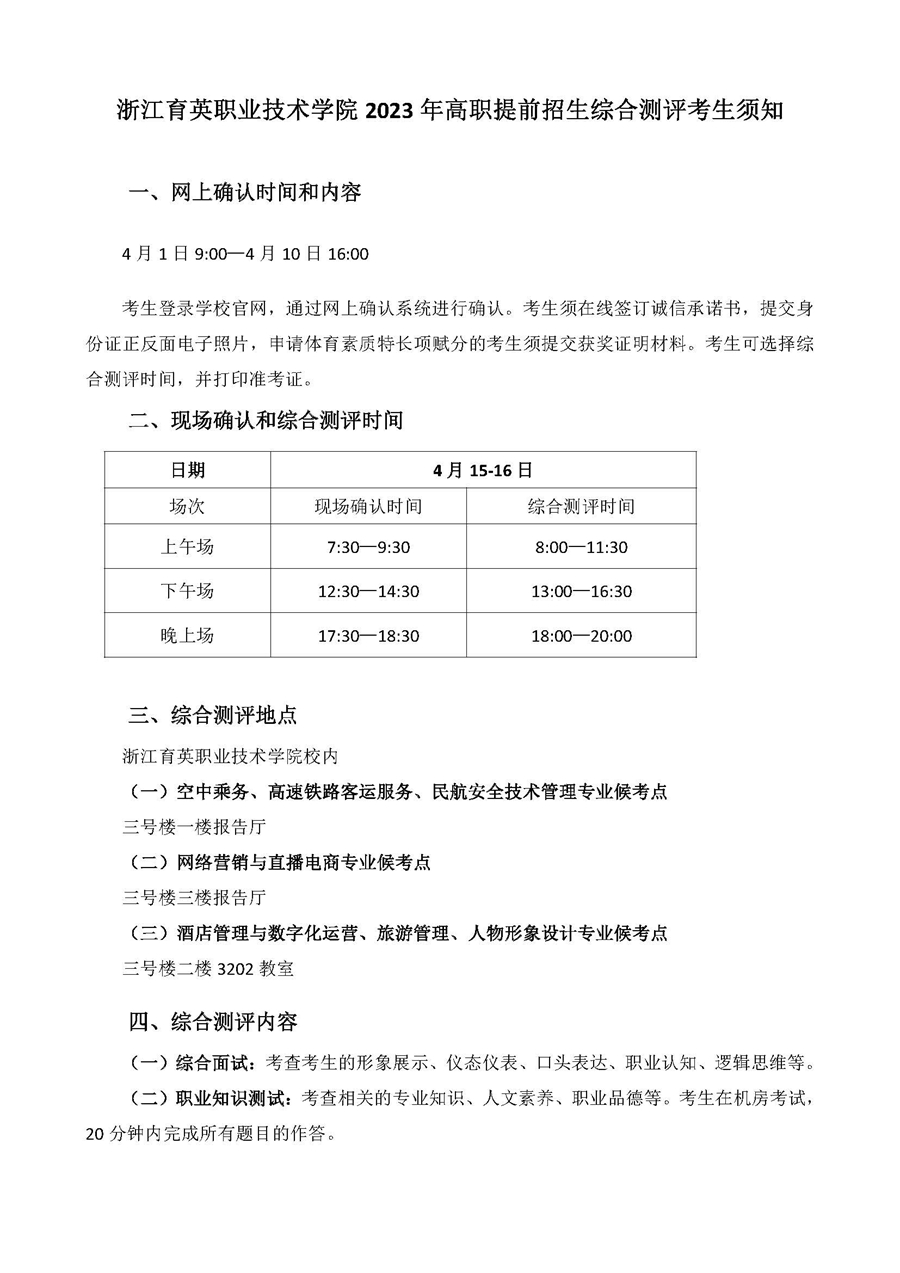 招生咨询 招生公告 报考指南 提前招生 历年分数 2025年招生专栏 录取查询 在线咨询 联系我们 地址:杭州市钱塘区4号大街16号 邮编:310018 电话:0571-86911032、86877189 招生公告 当前位置:首页 >> 招生咨询 >> 招生公告 浙江育英职业技术学院2023年高职提前招生综合测评考生须知 时间:2023-03-31
