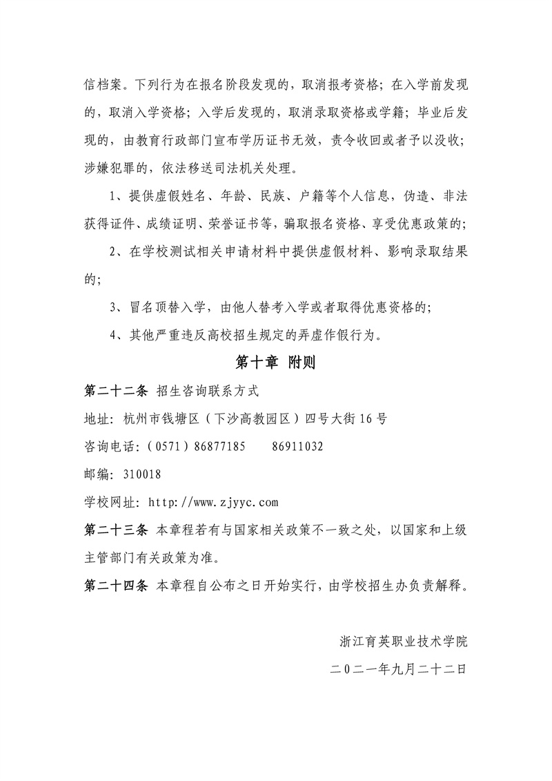 招生咨询 招生公告 报考指南 提前招生 历年分数 2025年招生专栏 录取查询 在线咨询 联系我们 地址:杭州市钱塘区4号大街16号 邮编:310018 电话:0571-86911032、86877189 招生公告 当前位置:首页 >> 招生咨询 >> 招生公告 浙江育英职业技术学院2021年高职扩招章程 时间:2021-09-23