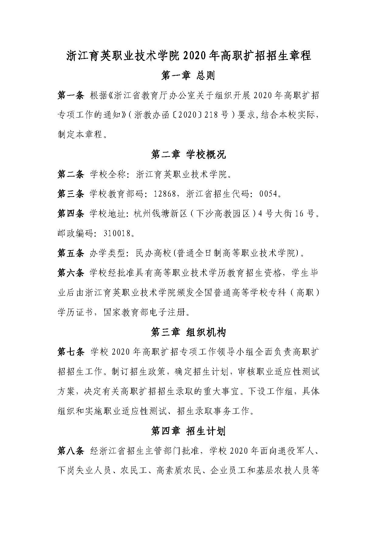 招生咨询 招生公告 报考指南 提前招生 历年分数 2025年招生专栏 录取查询 在线咨询 联系我们 地址:杭州市钱塘区4号大街16号 邮编:310018 电话:0571-86911032、86877189 招生公告 当前位置:首页 >> 招生咨询 >> 招生公告 浙江育英职业技术学院2020年高职扩招招生章程 时间:2020-09-27