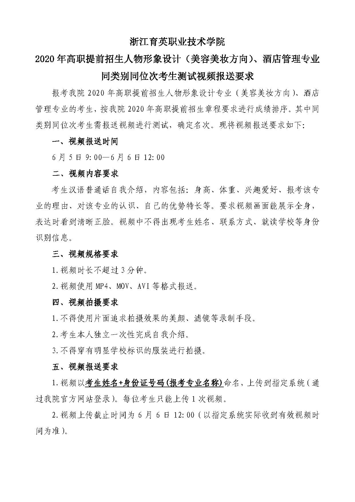 招生咨询 招生公告 报考指南 提前招生 历年分数 2025年招生专栏 录取查询 在线咨询 联系我们 地址:杭州市钱塘区4号大街16号 邮编:310018 电话:0571-86911032、86877189 招生公告 当前位置:首页 >> 招生咨询 >> 招生公告 2020年高职提前招生人物形象设计专业、酒店管理专业同类别同位次考生测试视频报送要求 时间:2020-06-05 点击进入视频报送系统