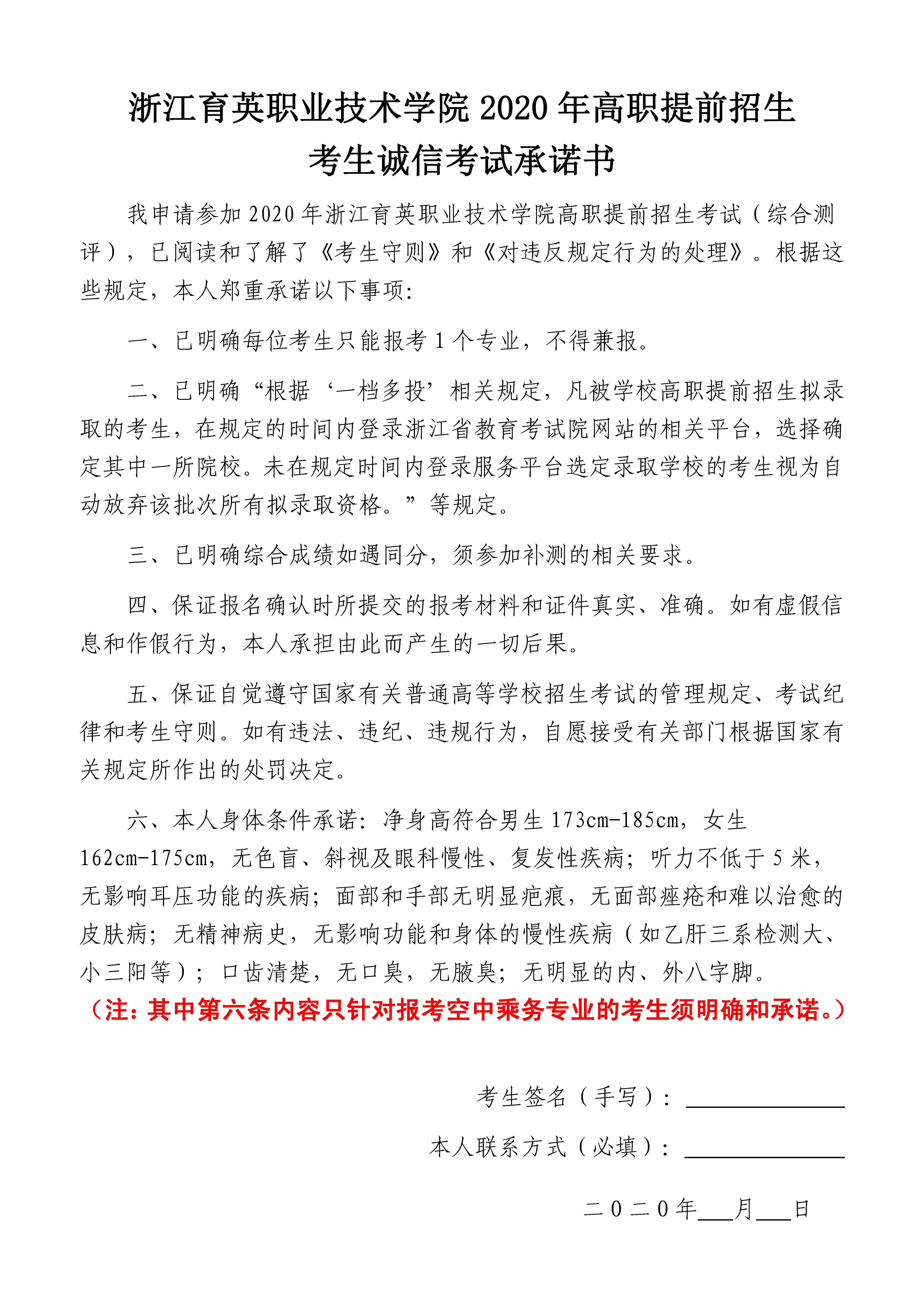 招生咨询 招生公告 报考指南 提前招生 历年分数 2025年招生专栏 录取查询 在线咨询 联系我们 地址:杭州市钱塘区4号大街16号 邮编:310018 电话:0571-86911032、86877189 招生公告 当前位置:首页 >> 招生咨询 >> 招生公告 浙江育英职业技术学院2020年高职提前招生考生诚信考试承诺书 时间:2020-05-10