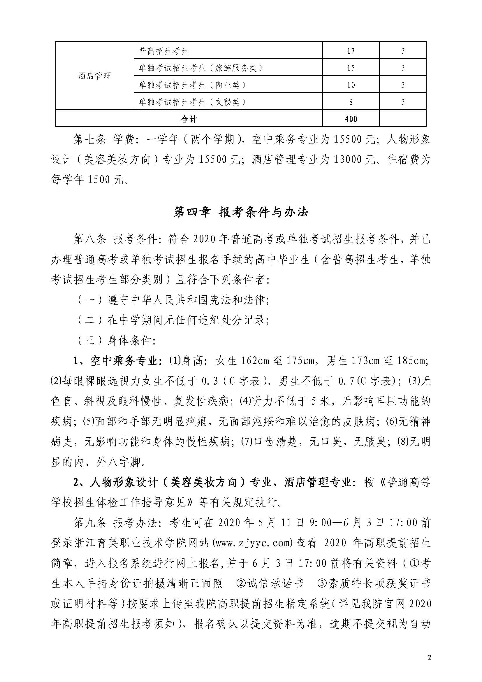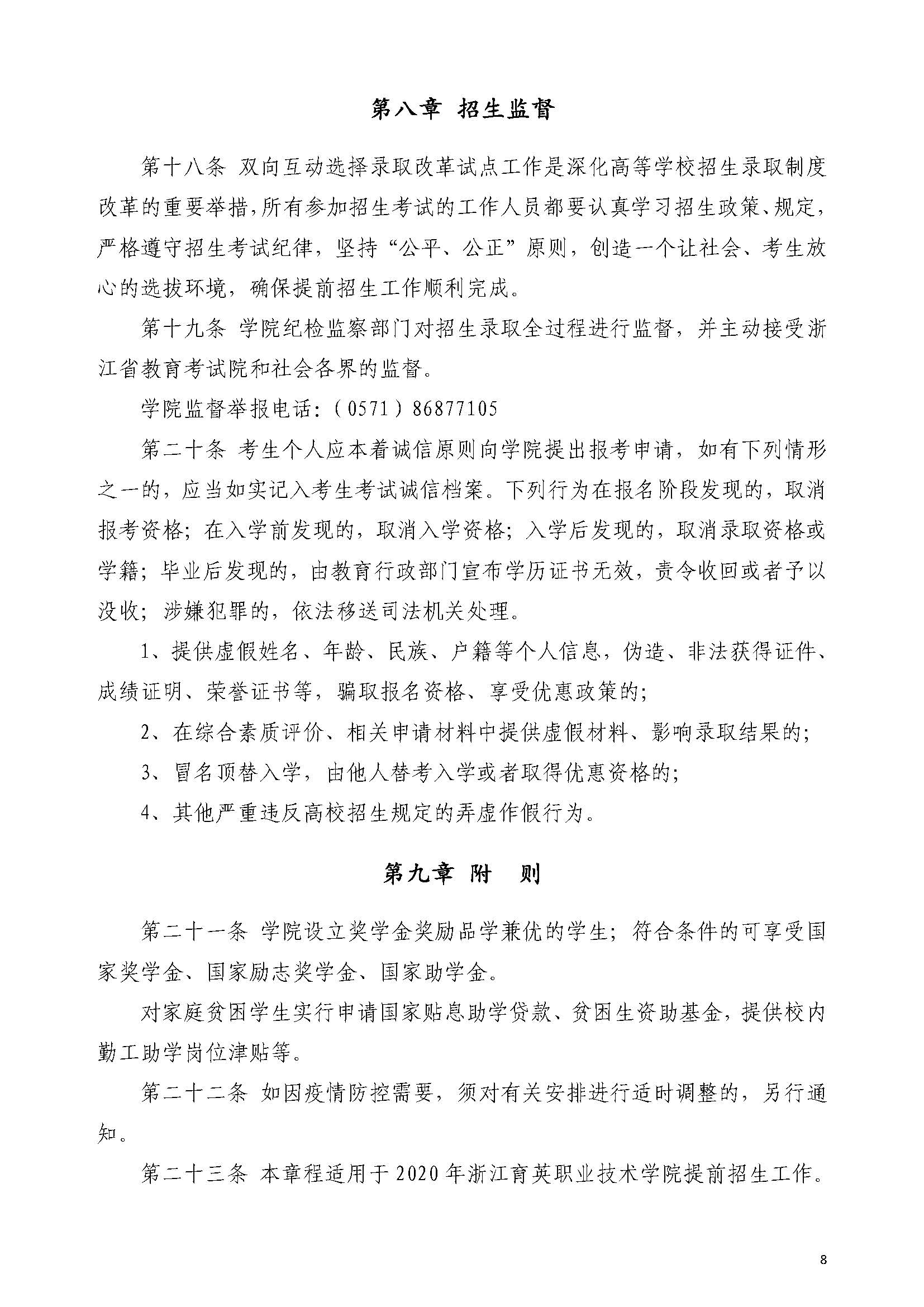招生咨询 招生公告 报考指南 提前招生 历年分数 2025年招生专栏 录取查询 在线咨询 联系我们 地址:杭州市钱塘区4号大街16号 邮编:310018 电话:0571-86911032、86877189 招生公告 当前位置:首页 >> 招生咨询 >> 招生公告 浙江育英职业技术学院2020年高职提前招生章程 时间:2020-05-10