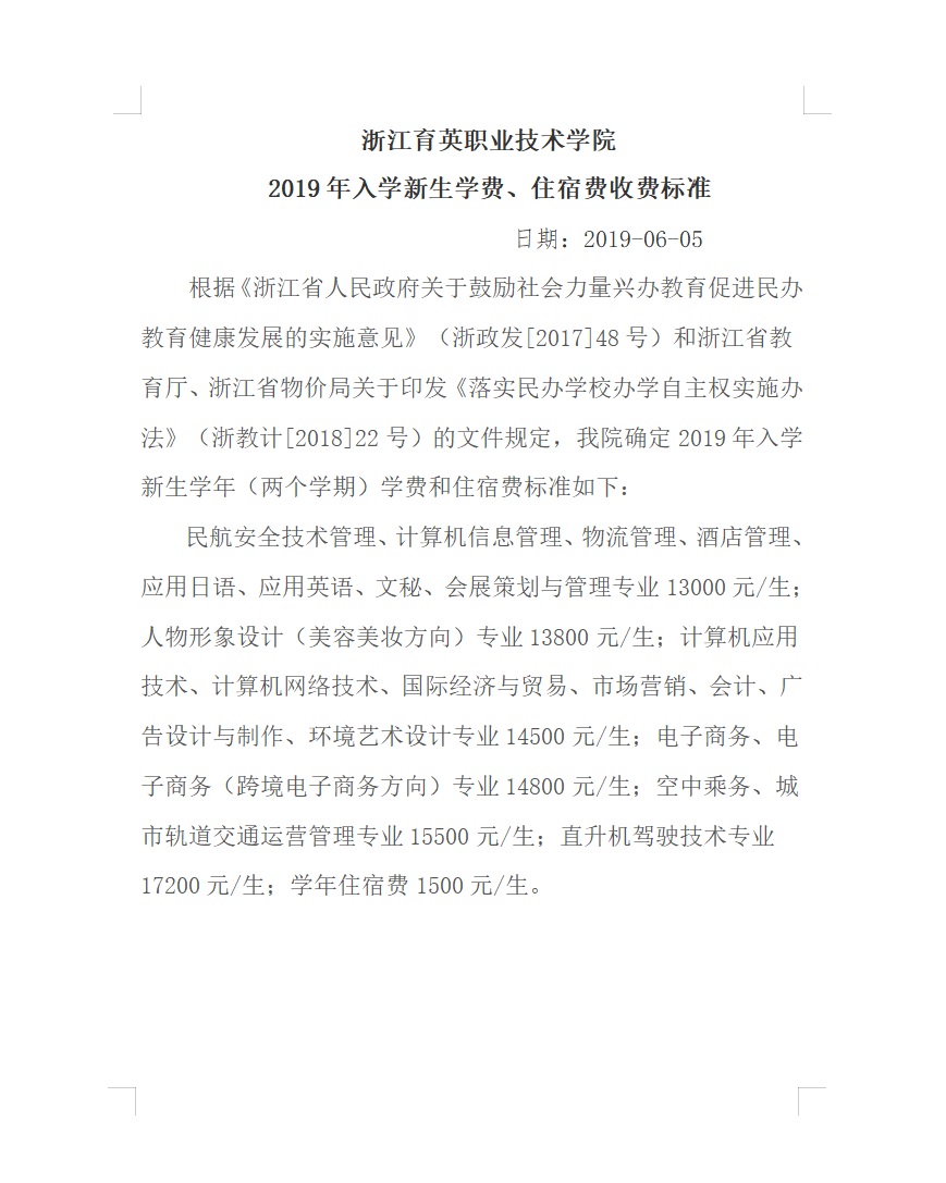 招生咨询 招生公告 报考指南 提前招生 历年分数 2025年招生专栏 录取查询 在线咨询 联系我们 地址:杭州市钱塘区4号大街16号 邮编:310018 电话:0571-86911032、86877189 招生公告 当前位置:首页 >> 招生咨询 >> 招生公告 浙江育英职业技术学院2019年入学新生学费、住宿费收费标准 时间:2019-06-05