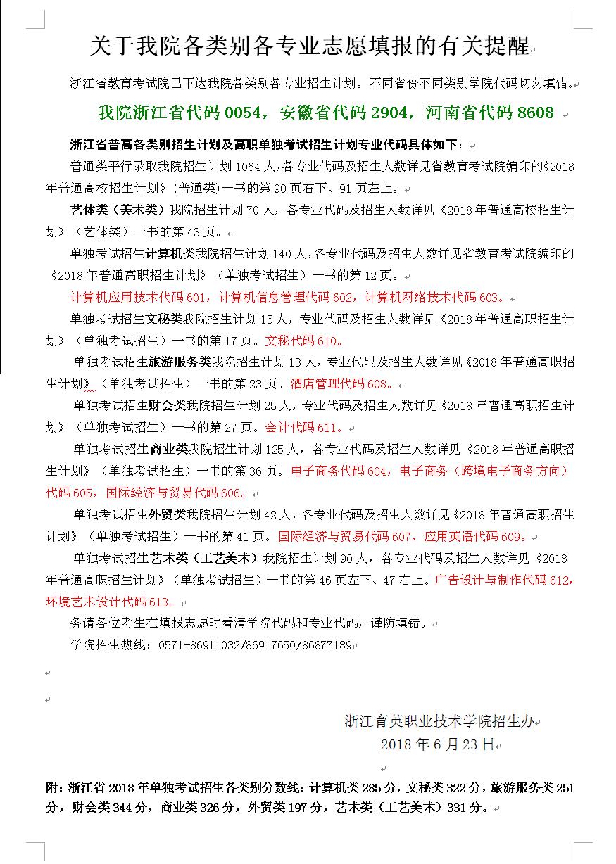 招生咨询 招生公告 报考指南 提前招生 历年分数 2025年招生专栏 录取查询 在线咨询 联系我们 地址:杭州市钱塘区4号大街16号 邮编:310018 电话:0571-86911032、86877189 招生公告 当前位置:首页 >> 招生咨询 >> 招生公告 关于我院各类别各专业志愿填报的有关提醒 时间:2018-06-23