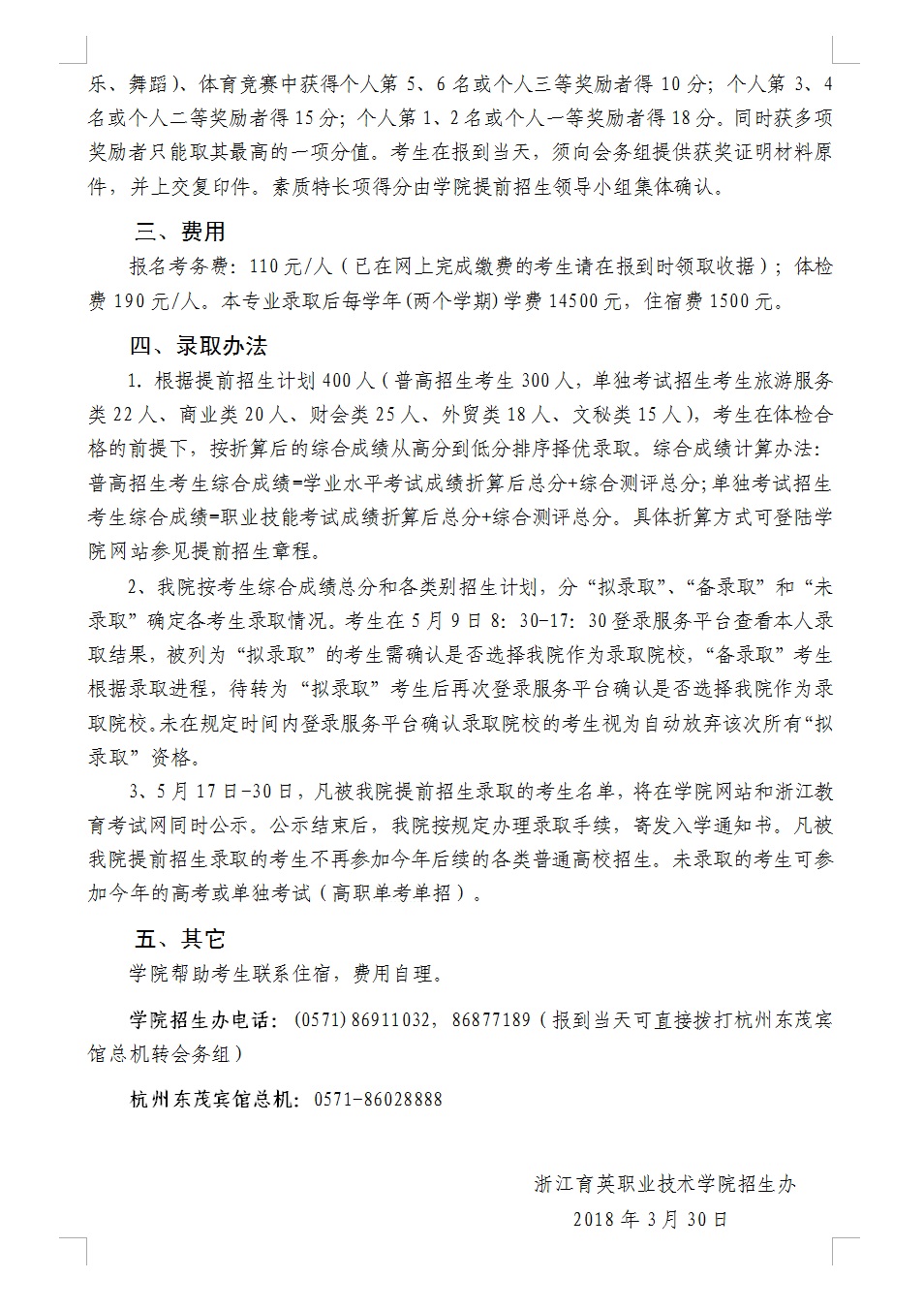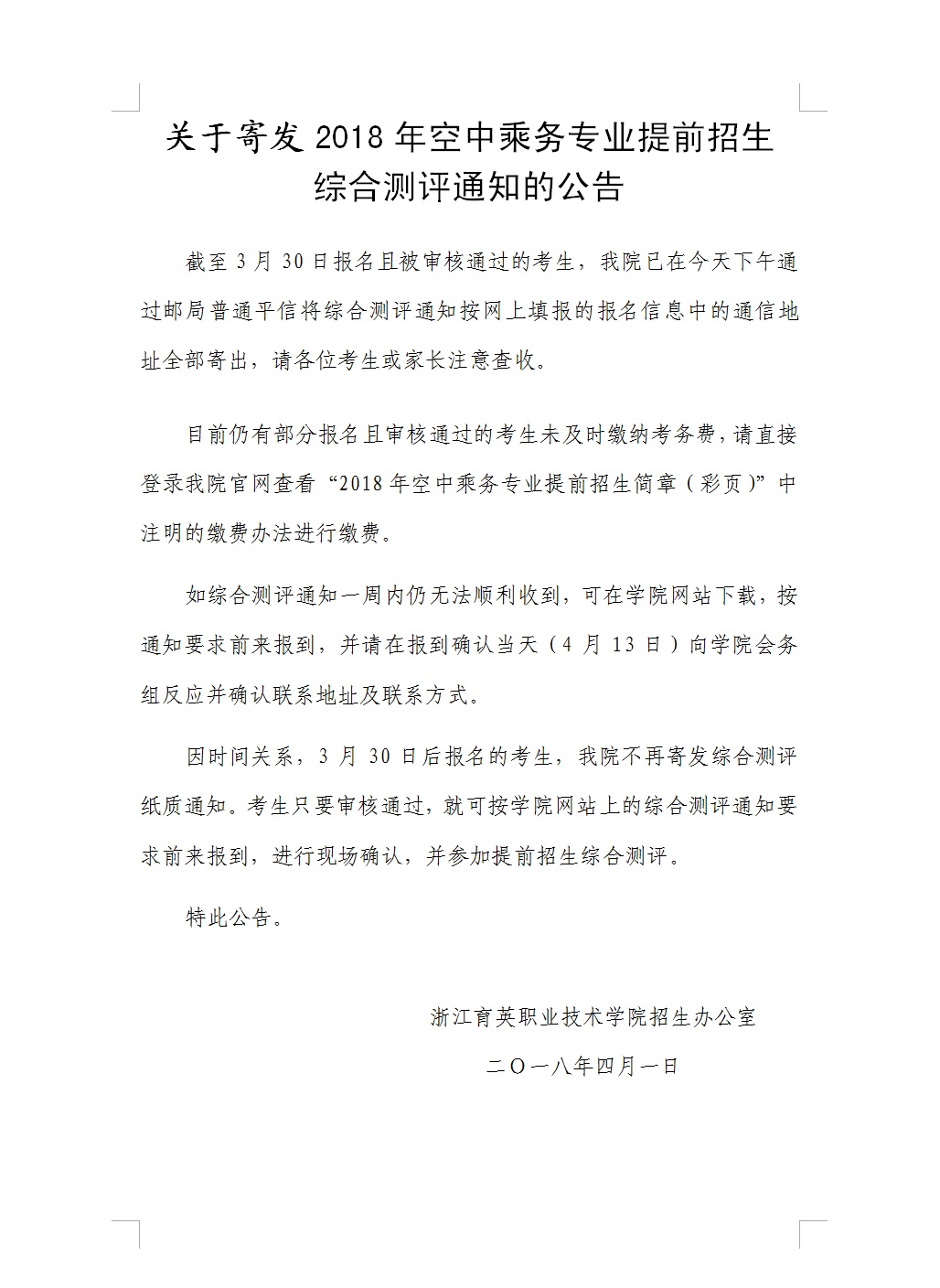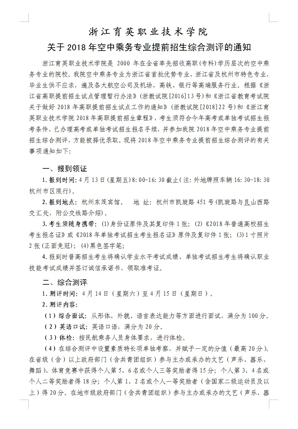 招生咨询 招生公告 报考指南 提前招生 历年分数 2025年招生专栏 录取查询 在线咨询 联系我们 地址:杭州市钱塘区4号大街16号 邮编:310018 电话:0571-86911032、86877189 招生公告 当前位置:首页 >> 招生咨询 >> 招生公告 关于寄发2018年空中乘务专业提前招生综合测评通知的公告 时间:2018-04-01 附件:2018年空中乘务专业提前招生综合测评通知