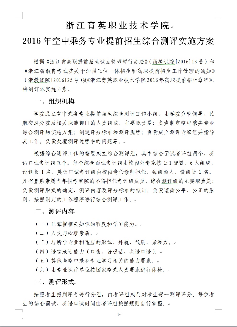 招生咨询 招生公告 报考指南 提前招生 历年分数 2025年招生专栏 录取查询 在线咨询 联系我们 地址:杭州市钱塘区4号大街16号 邮编:310018 电话:0571-86911032、86877189 招生公告 当前位置:首页 >> 招生咨询 >> 招生公告 2016年空中乘务专业提前招生综合测评实施方案 时间:2016-04-11