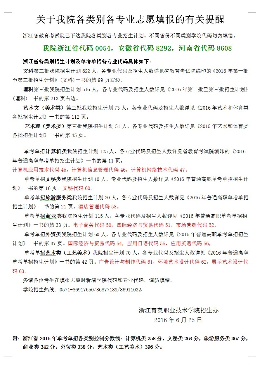 招生咨询 招生公告 报考指南 提前招生 历年分数 2025年招生专栏 录取查询 在线咨询 联系我们 地址:杭州市钱塘区4号大街16号 邮编:310018 电话:0571-86911032、86877189 招生公告 当前位置:首页 >> 招生咨询 >> 招生公告 关于我院各类别各专业志愿填报的有关提醒 时间:2016-06-26
