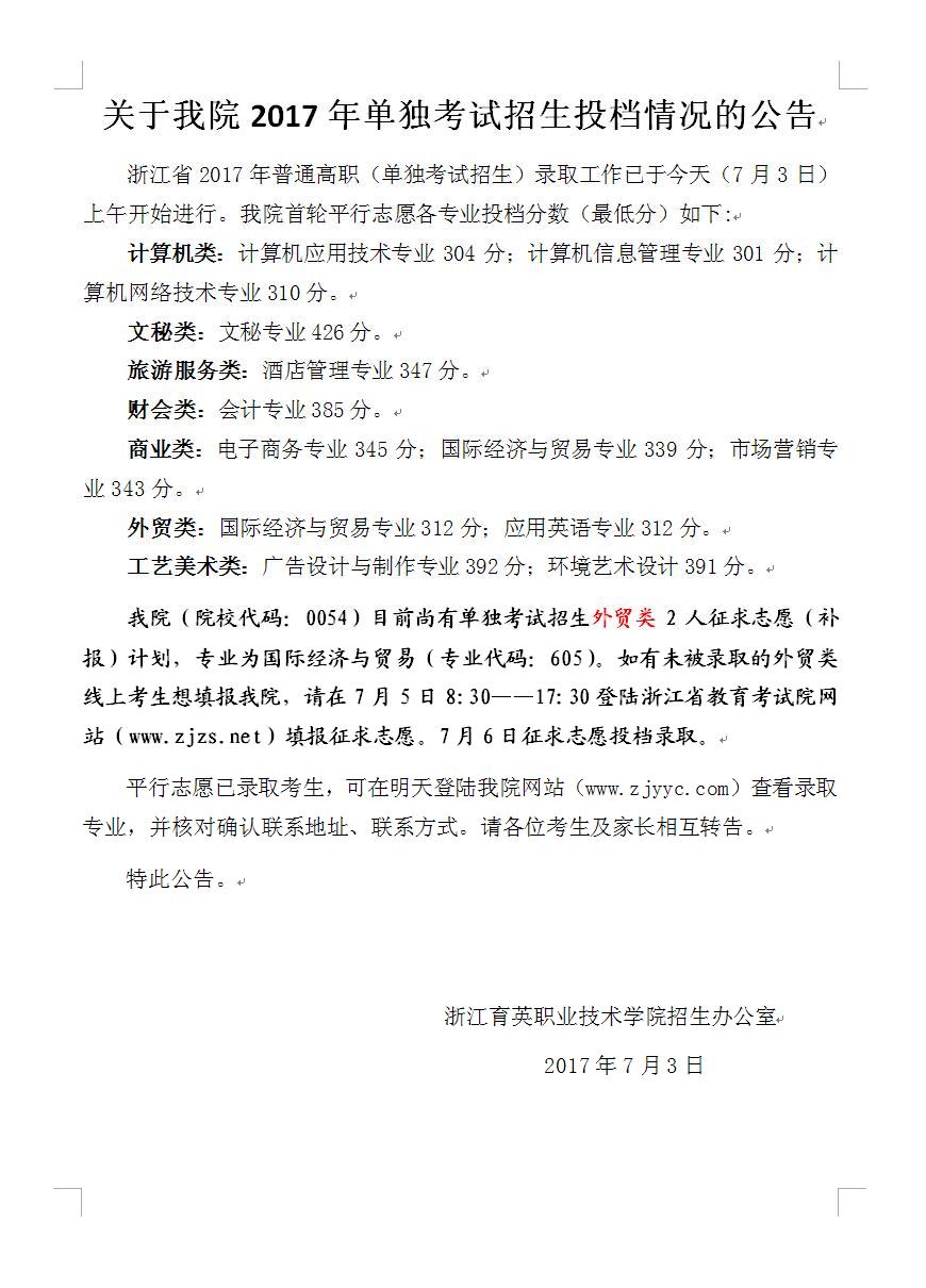 招生咨询 招生公告 报考指南 提前招生 历年分数 2025年招生专栏 录取查询 在线咨询 联系我们 地址:杭州市钱塘区4号大街16号 邮编:310018 电话:0571-86911032、86877189 招生公告 当前位置:首页 >> 招生咨询 >> 招生公告 关于我院2017年单独考试招生投档情况的公告 时间:2017-07-03