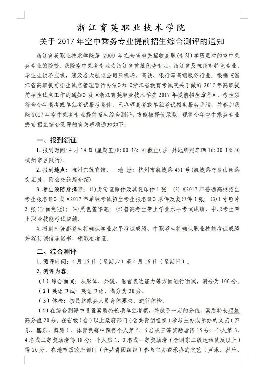 招生咨询 招生公告 报考指南 提前招生 历年分数 2025年招生专栏 录取查询 在线咨询 联系我们 地址:杭州市钱塘区4号大街16号 邮编:310018 电话:0571-86911032、86877189 招生公告 当前位置:首页 >> 招生咨询 >> 招生公告 关于2017年空乘提前招生综合测评的通知 时间:2017-04-05