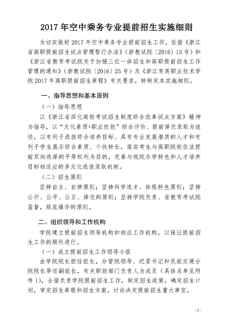 招生咨询 招生公告 报考指南 提前招生 历年分数 2025年招生专栏 录取查询 在线咨询 联系我们 地址:杭州市钱塘区4号大街16号 邮编:310018 电话:0571-86911032、86877189 招生公告 当前位置:首页 >> 招生咨询 >> 招生公告 浙江育英职业技术学院2017年空乘提前招生实施细则 时间:2017-03-31