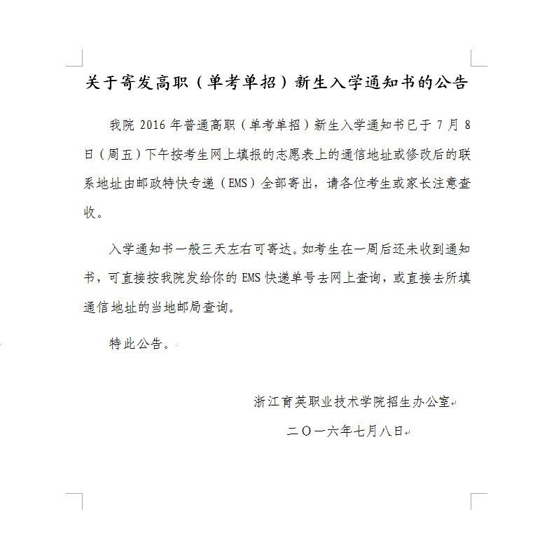 招生咨询 招生公告 报考指南 提前招生 历年分数 2025年招生专栏 录取查询 在线咨询 联系我们 地址:杭州市钱塘区4号大街16号 邮编:310018 电话:0571-86911032、86877189 招生公告 当前位置:首页 >> 招生咨询 >> 招生公告 关于寄发高职(单考单招)新生入学通知书的公告 时间:2016-07-08