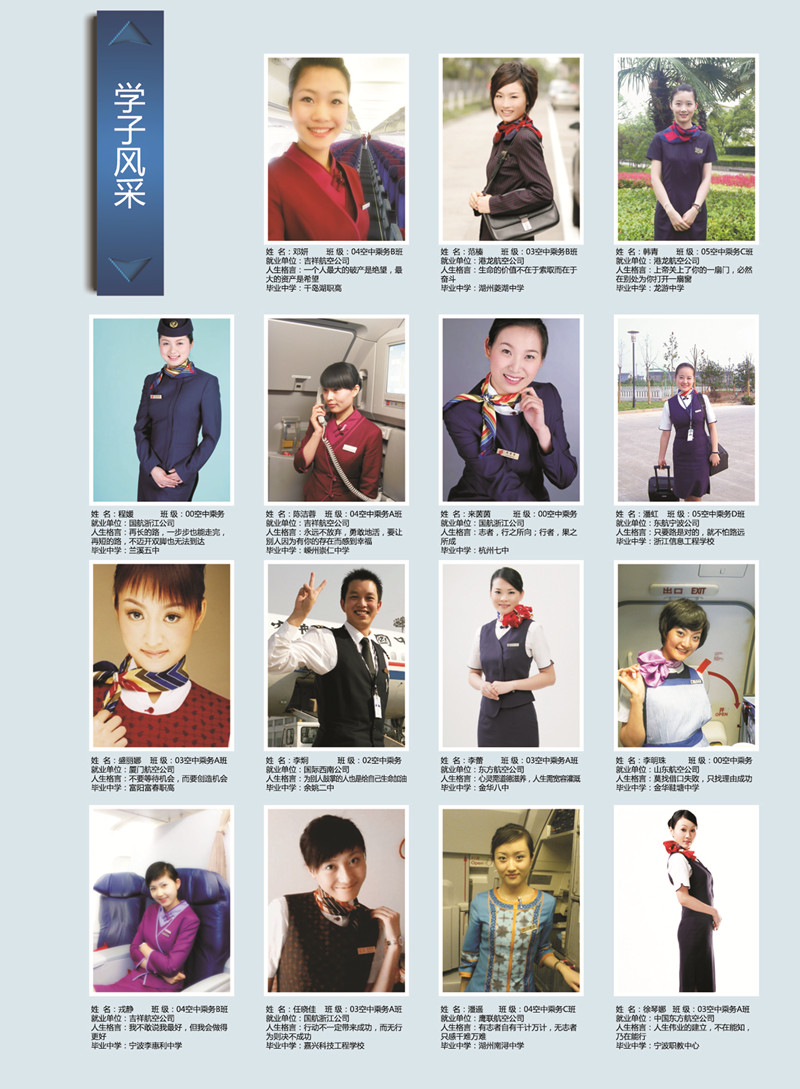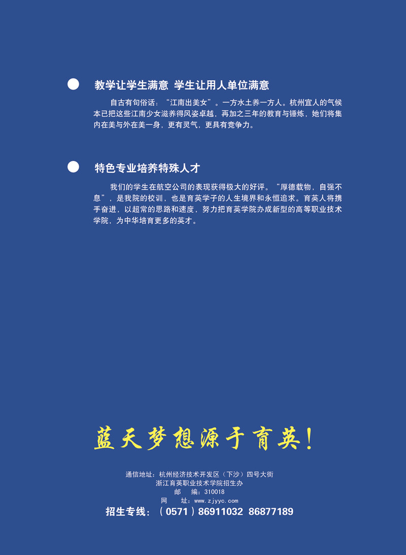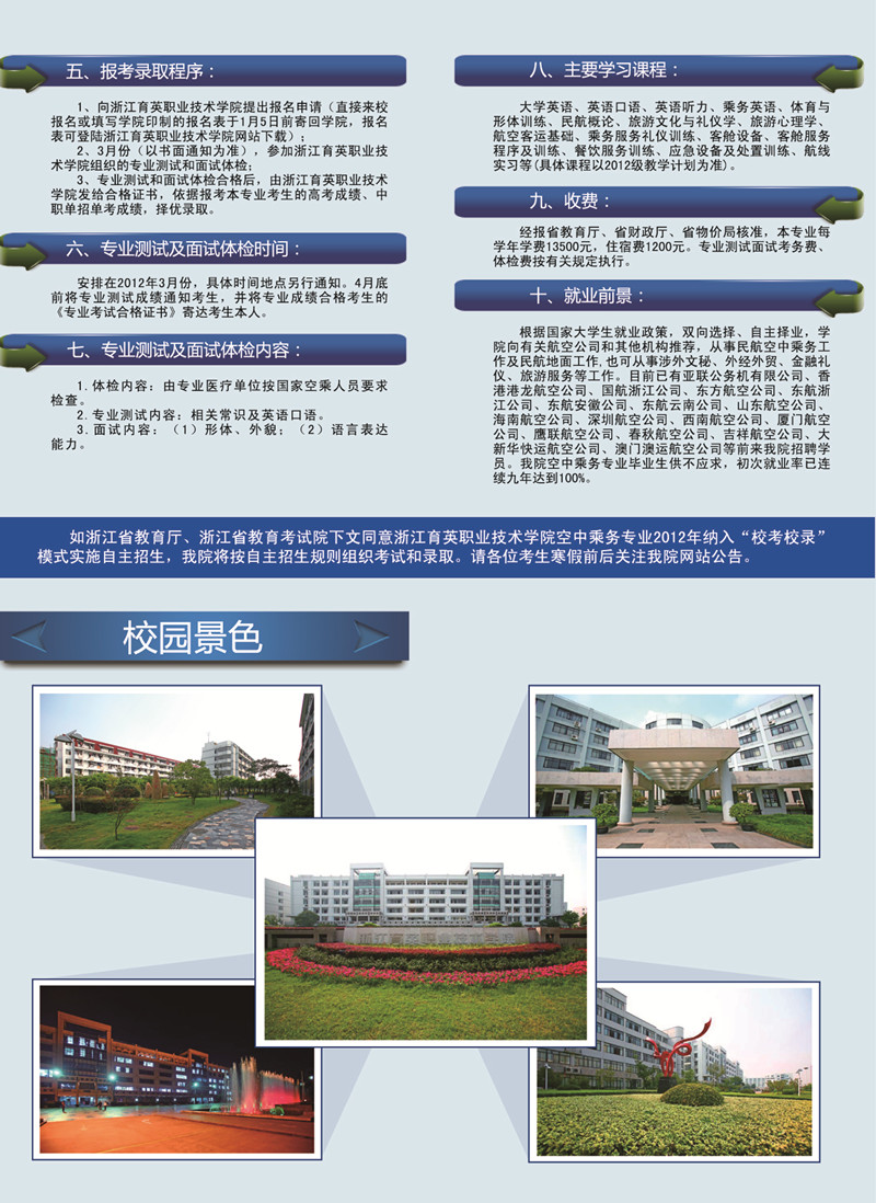 招生咨询 招生公告 报考指南 提前招生 历年分数 2025年招生专栏 录取查询 在线咨询 联系我们 地址:杭州市钱塘区4号大街16号 邮编:310018 电话:0571-86911032、86877189 招生公告 当前位置:首页 >> 招生咨询 >> 招生公告 2012年空中乘务专业招生简章 (彩页) 时间:2011-12-02 [附:2012年空中乘务专业考生报名表] (报名表下载后请以A4纸打印,填好后邮寄至我院招生办)