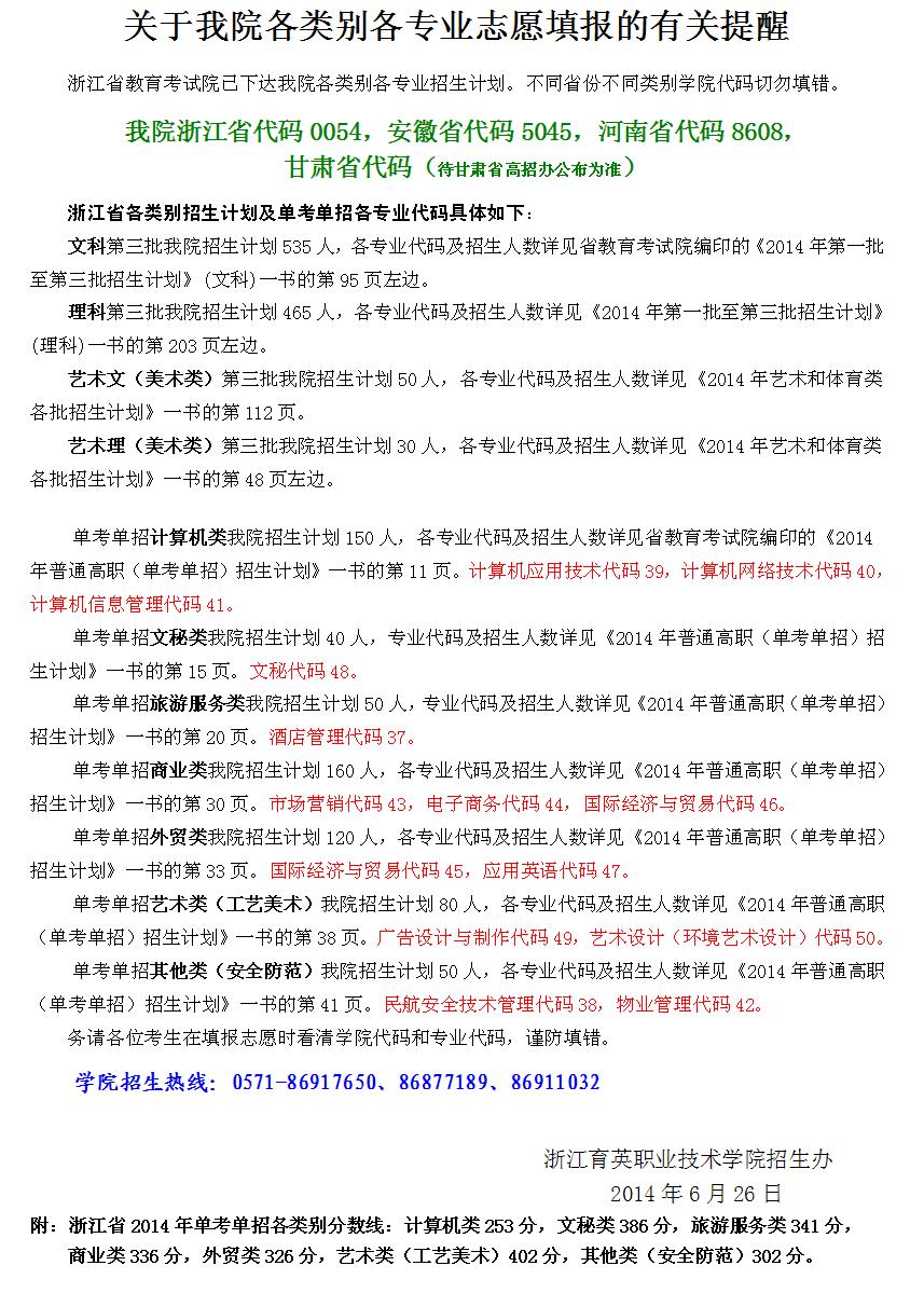 招生咨询 招生公告 报考指南 提前招生 历年分数 2025年招生专栏 录取查询 在线咨询 联系我们 地址:杭州市钱塘区4号大街16号 邮编:310018 电话:0571-86911032、86877189 招生公告 当前位置:首页 >> 招生咨询 >> 招生公告 关于我院各类别各专业志愿填报的有关提醒 时间:2014-06-26