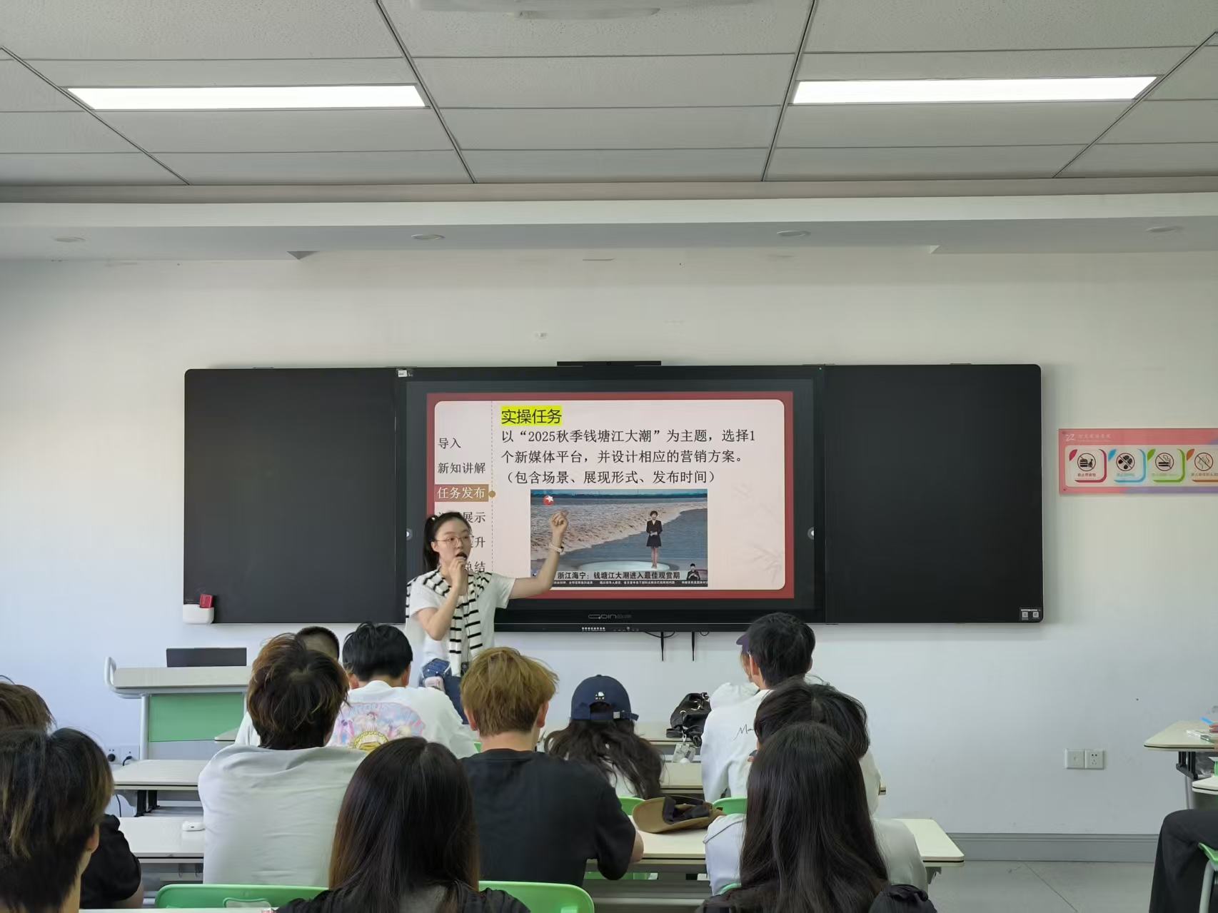 课堂不再是传统的“教师讲、学生听”。课程伊始,余欣航老师便以近期各文旅平台的热点案例切入,引导学生对比同一内容在抖音、微博、微信、小红书等平台的不同呈现。“针对钱塘江大潮营销,你会选哪个平台?为什么?”一个开放式问题,瞬间点燃学生思维火花。随后的教学环环相扣:在系统讲解各平台特性与“中央厨房”式分发策略后,学生立即进入“实战状态”——以小组为单位,为“2025秋季钱塘江大潮”量身定制跨平台内容矩阵与创作提纲。从矩阵搭建到文案构思,理论知识在小组协作中迅速转化为实践方案。