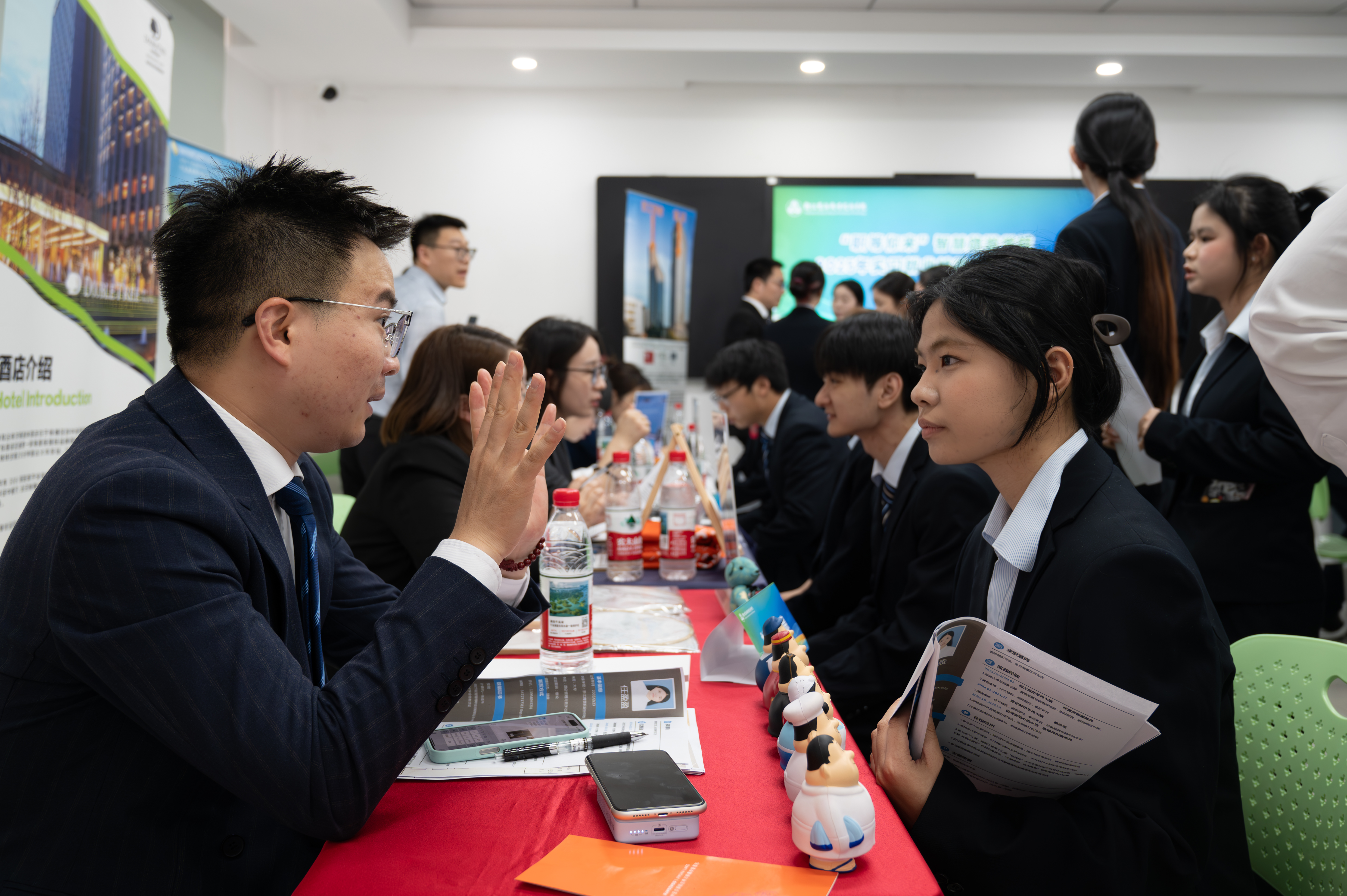 招聘会现场人潮涌动,企业展位前围满咨询和面试的学生。万豪集团、洲际集团、携程旅行、国际会展中心等企业通过宣传展板、一对一讲解等方式,全面展示企业情况与岗位招聘信息。学生们手持精心准备的简历,主动询问岗位晋升路径、实习待遇等细节,现场完成初试,与企业达成初步意向。