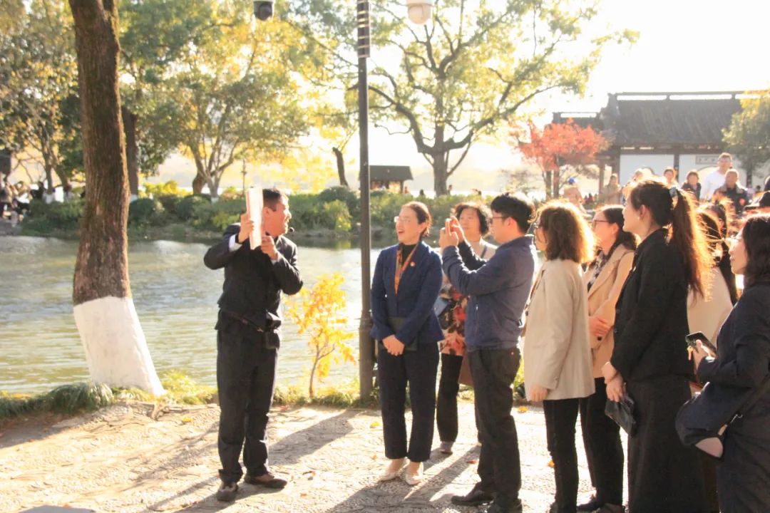 杭州市西湖游船有限公司党总支副书记、总经理何永红,党总支委员、副总经理、工会主席孙艳,党总支干事、工会副主席王晓斓,人力资源部经理余长金,智慧旅游学院党总支书记、院长黄华,党总支副书记、院长助理张丹,党总支委员、教工支部书记黄静,以及校企双方全体党员、实习生代表,齐聚西湖红舫,寻伟人足迹,忆峥嵘岁月,品诗画江南,话美好生活。