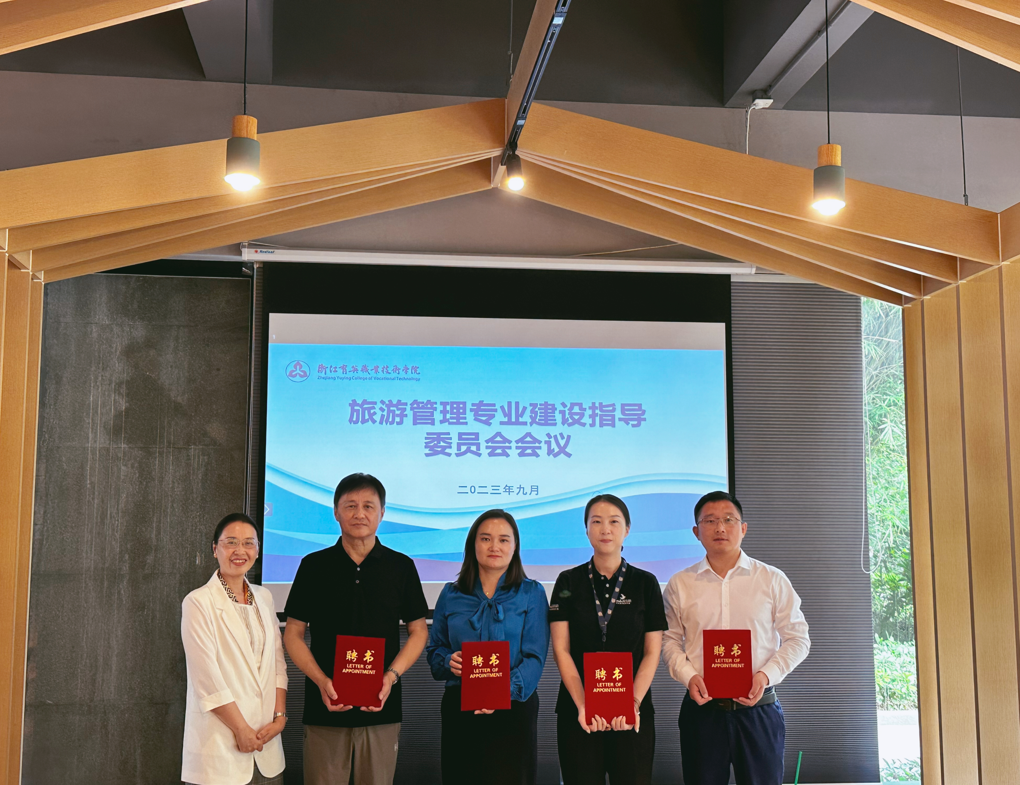 中国国旅(浙江)国际旅行社有限公司董事、总经理许亮、杭州长乔旅游投资集团股份有限公司助理总裁王燕茹、杭州开元森泊旅游投资有限公司总经理助理兼人力资源总监陈静、浙江横店影视城有限公司人力资源部副部长李建杰、学院领导及旅管专业全体老师。
