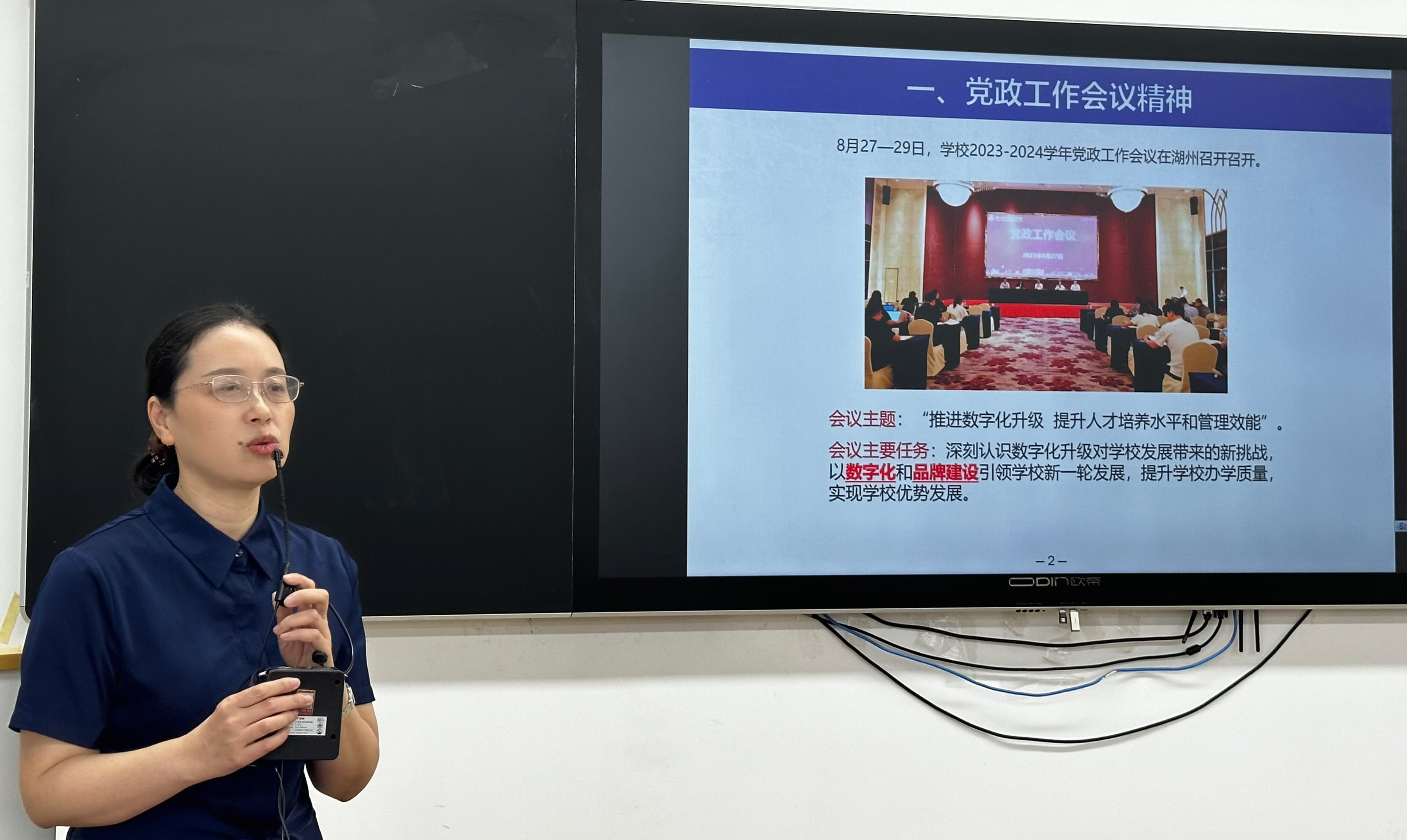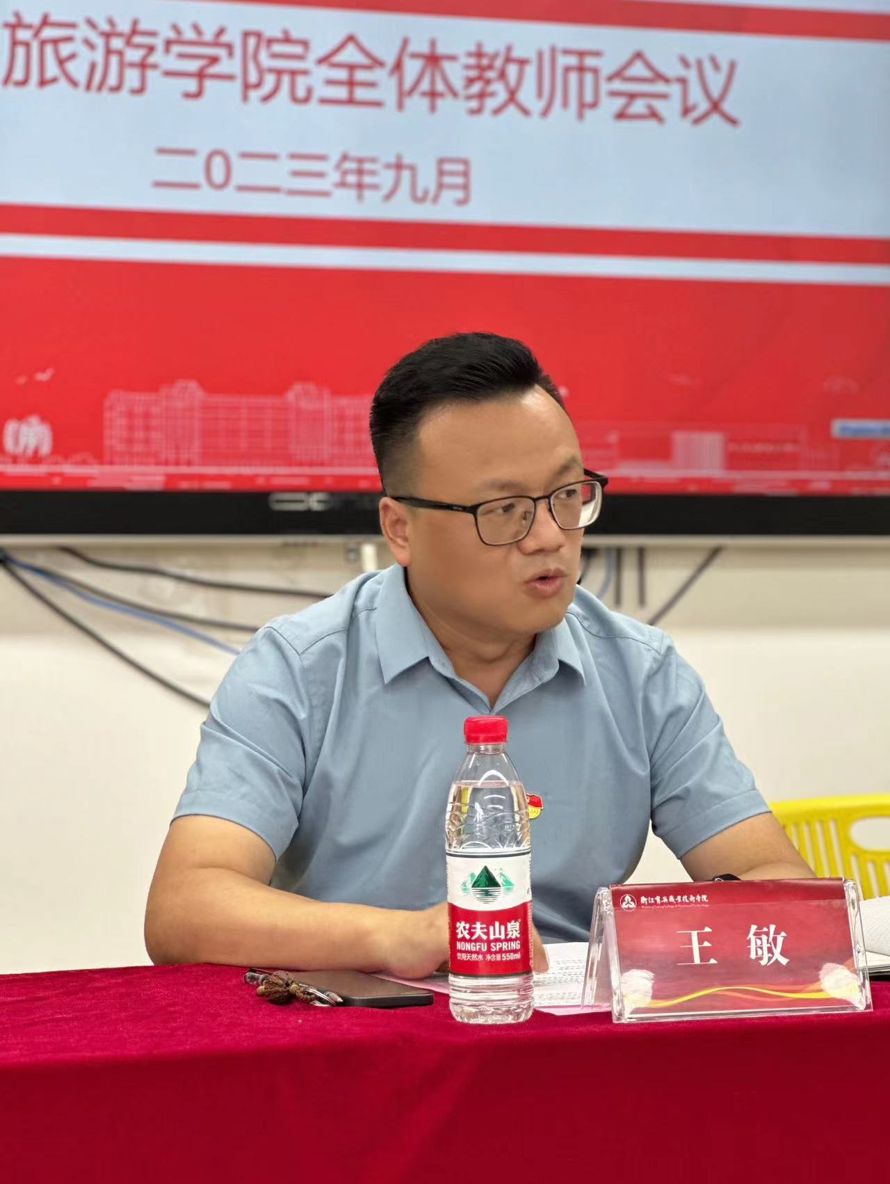 会议第一项,学校副校长王敏发表重要讲话。副校长王敏介绍了新学年智慧旅游学院的人事调整情况,充分肯定了学院原党总支副书记谢剑峰同志多年来的工作成绩,同时也表达了对学院现党总支副书记张丹同志的信任,并希望新领导班子能够带领智慧旅游学院迈向新的征程。