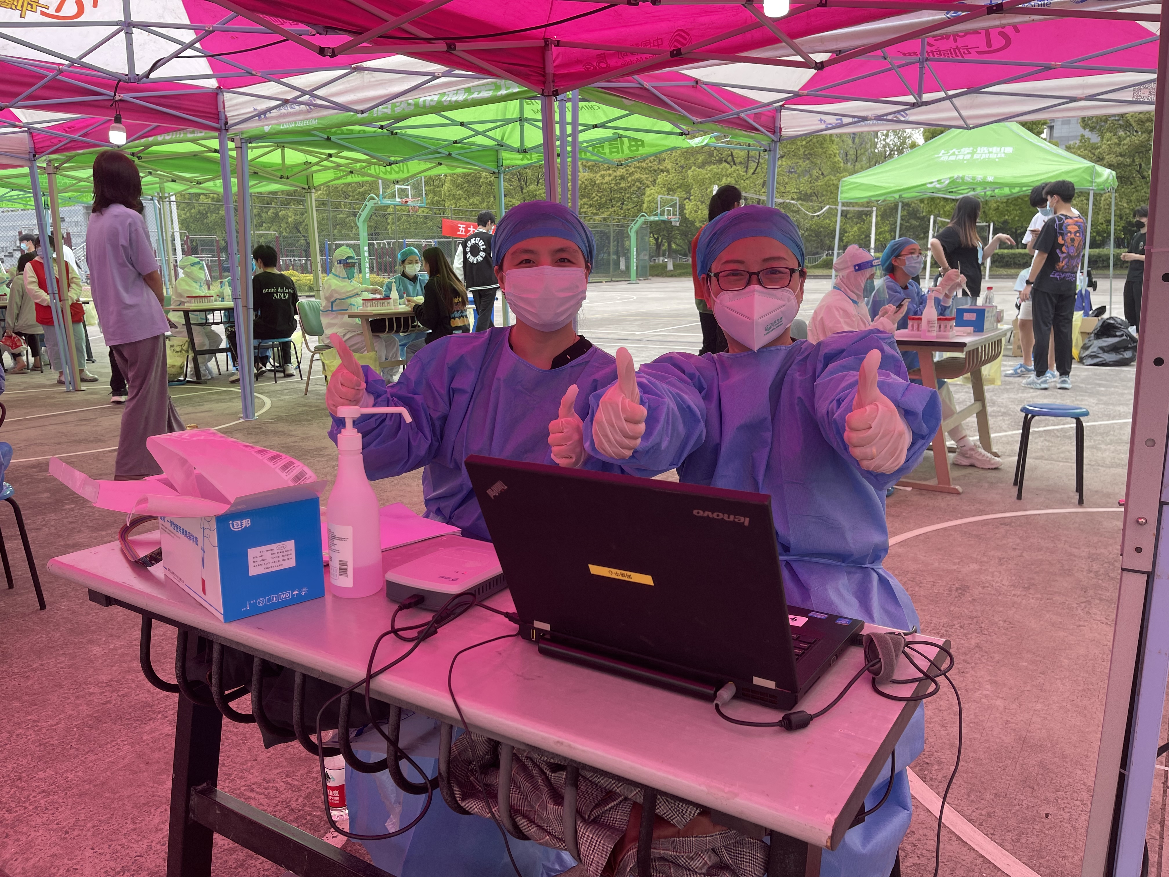 因为是第一次做此类志愿者,也为了更好地熟悉工作场地及工作内容,两位老师于中午12点便早早到达了核酸检测地点,认真做好相关准备工作,下午13:00正式开始协助医生进行核酸检测相关工作。她们的工作任务是确保正确的检测人数,检查和输入身份证信息,按要求贴记录用和试管的标签,记录被测人员身份证号码、维护检测秩序等等。所有的志愿者老师都穿着防护服装,在下午的艳阳下如火如荼地展开着检测工作,虽然辛苦,但内心却很充实,这份充实来自于对集体和社会的责任感,更是来自于作为育英人对于学生、学校和教育工作的深深热爱。