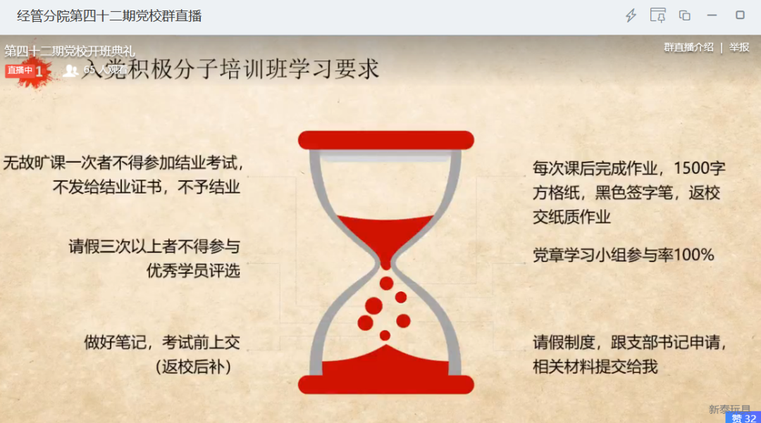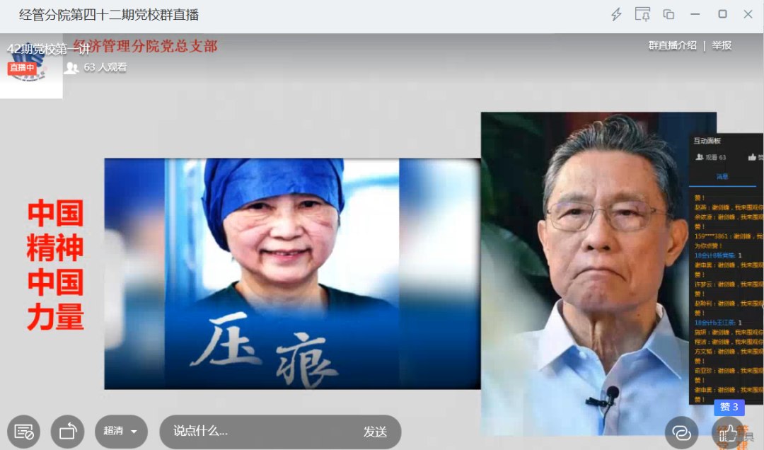 本次直播由党校负责人庞璁老师主持,首先庞璁老师介绍了经济管理分院党组织的架构,向学员们介绍了各位书记,之后依次连线了分院学生党支部的两位支部书记杨梦乐老师和冯建军老师。两位支部书记都对全体党校学员寄予了厚望,希望他们能学有所成,积极向党组织靠拢。然后庞老师又向学员们详细解读了入党积极分子培训班的学习要求,并且明确了各项学习任务,强调了纪律和规范。