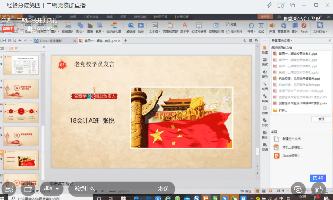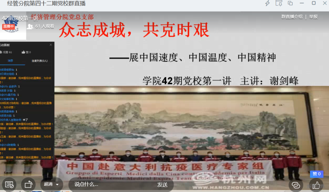 2020年4月3日,由于疫情的影响,新的一期党校学员暂未能返回校园,在这样一个特殊的时期,经济管理分院第四十二期党校采用钉钉直播的形式在网上举行了开班典礼。分院党总支书记谢剑峰,学生支部书记杨梦乐,冯建军,分院党总支组织委员庞璁,以及62名党校学员出席了这次开班典礼。