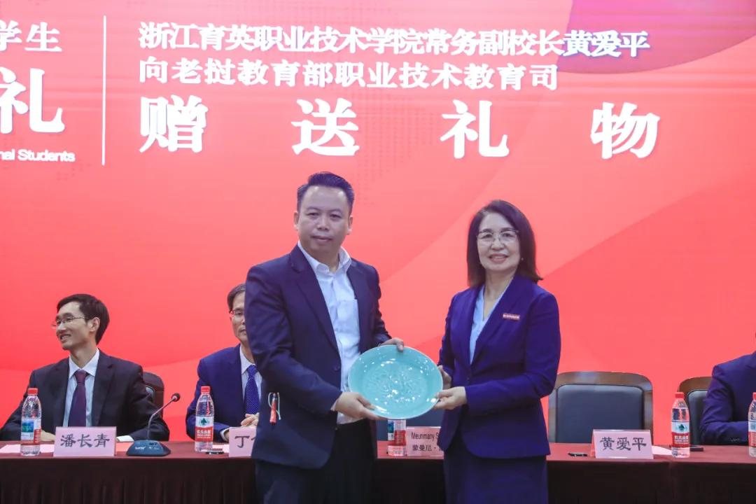 黄爱平向老挝教育与体育部职业技术教育司赠送礼物。
