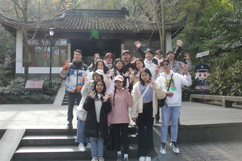 智慧旅游学院老师带领老挝留学生走进杭州市钱塘区义蓬街道火星村,参观手作农场、文化礼堂和乡村数字化管理赋能平台等场景,体验农事,了解火星村如何以红色文化、绿色田园为特色开辟休闲农旅观光的致富之路,切身感受中国新农村发展。在老挝国庆日带领老挝留学生攀登玉皇山,游览西湖、八卦田,了解杭州历史和文化。
