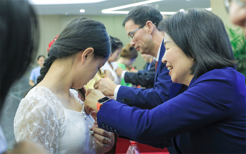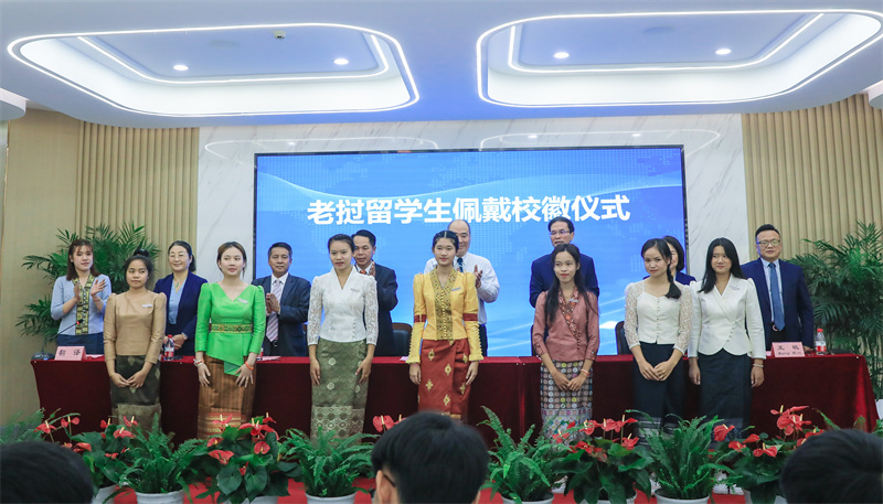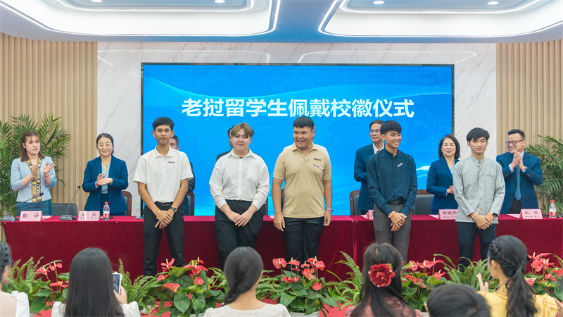 主席台领导为2023级老挝留学生佩戴校徽。