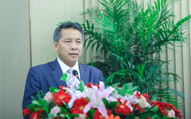 丁金昌致辞,他代表全校师生对老挝留学生表示热烈欢迎,介绍了学校留学生培养情况,并对老挝留学生提出希望。他说,今年恰逢“一带一路”倡议提出十周年,共建“一带一路”从中国倡议走向国际实践,从“大写意”到“工笔画”,取得了实打实、沉甸甸的成就,成为构建人类命运共同体的重大实践,开辟了人类共同实现现代化的新路径。同学们也成为共建“一带一路”教育行动的受益者。学校秉承“厚德载物,自强不息”的校训精神,坚持“教育是一种高尚的服务”的育人理念,积极推进教育国际化,不断加强与各个国家(地区)高校交流合作。从2016年开始,学校招收老挝留学生,已累计培养65名老挝籍优秀人才。毕业生回到老挝,从事翻译、导游、酒店管理等工作,其中有6位毕业生在中老铁路工作,担任电力机车副司机等职,为老挝的社会经济发展贡献了力量。