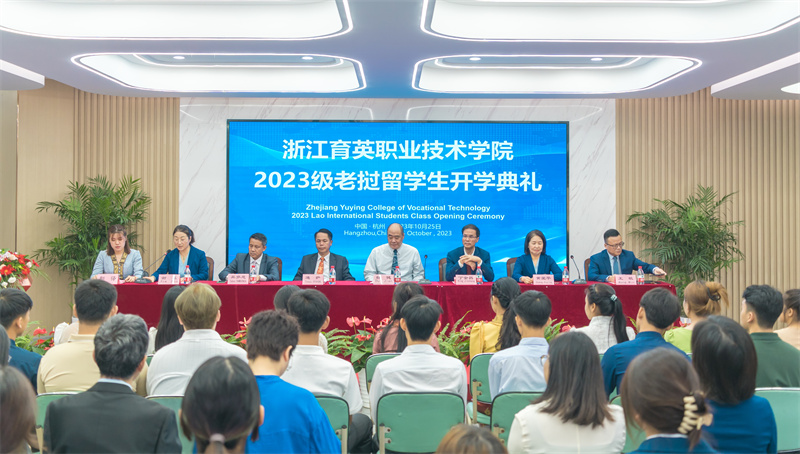 10月25日,2023级老挝留学生开学典礼在三号楼一楼大厅举行。老挝教育与体育部职业技术教育司副司长通萨,浙江省教育厅国际合作与交流处一级调研员杜健,学校校长丁金昌,常务副校长黄爱平,党委书记、副校长谢鑫,党委副书记、副校长王敏,智慧旅游学院领导黄华、张丹、周岚,各部门负责人等出席,19名2023级老挝留学生,智慧旅游学院师生代表参加。谢鑫主持开学典礼。