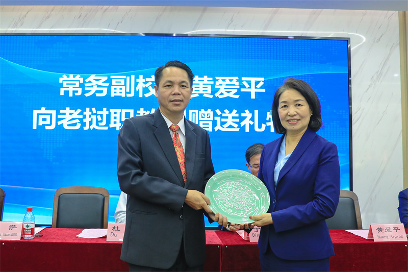 学校常务副校长黄爱平向老挝教育与体育部职业技术教育司赠送礼物。