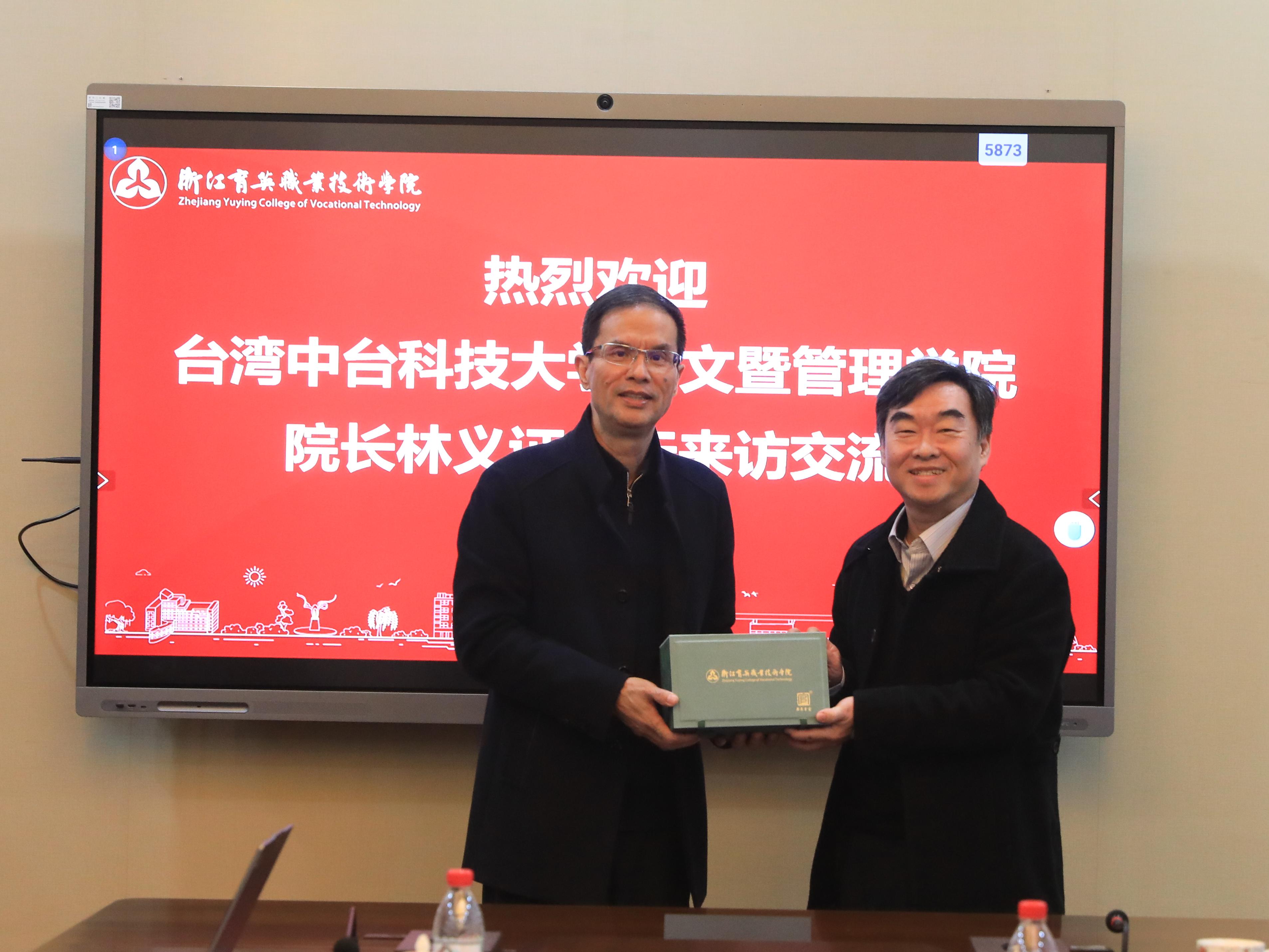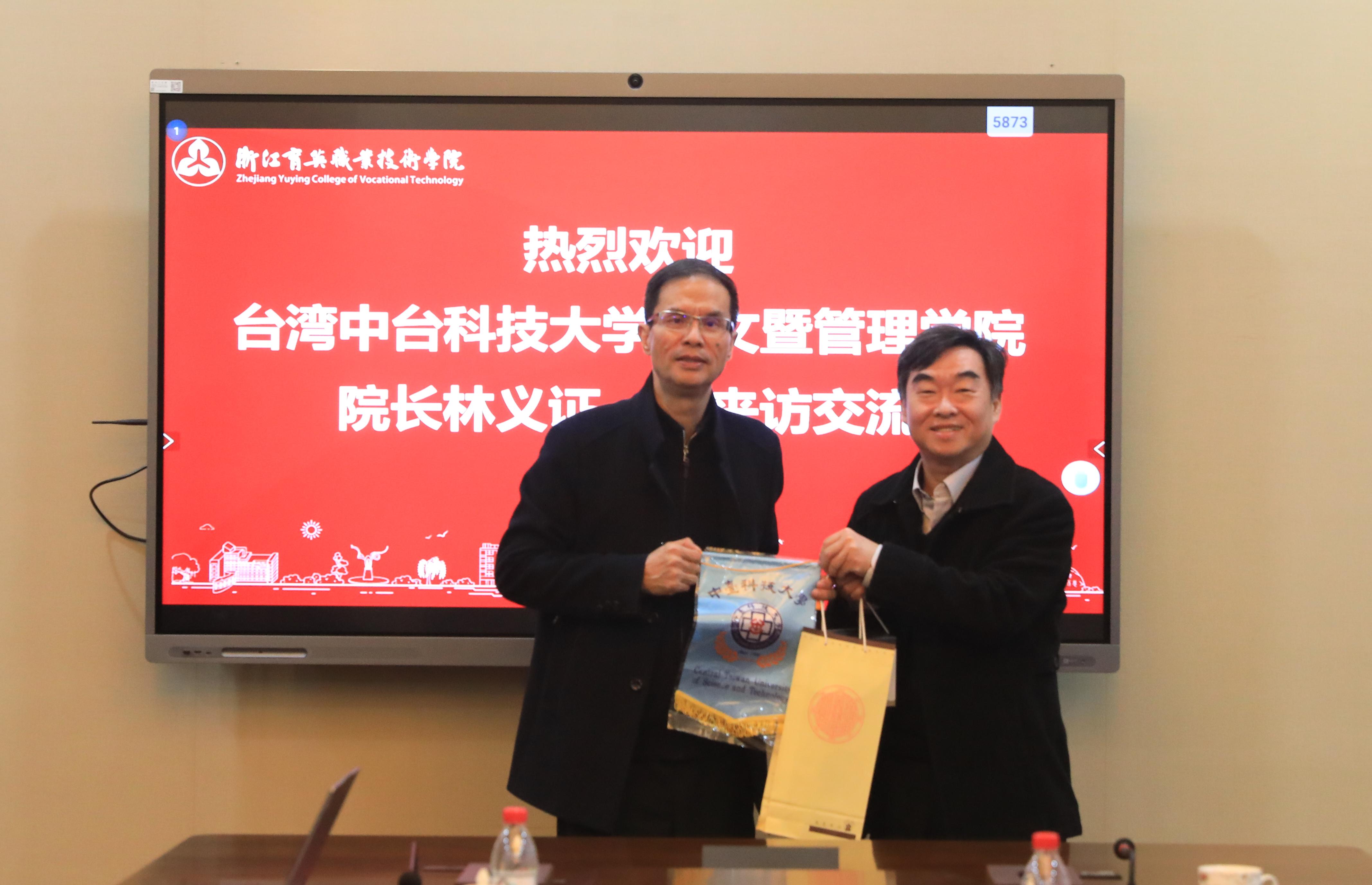 1月8日,台湾中台科技大学人文暨管理学院院长林义证,营销管理系主任王耀毅,杭州市人民政府台湾事务办公室经济处处长梅晓春,杭州市人民政府台湾事务办公室经济处陆军华一行4人访问我校。我校校长丁金昌,常务副校长黄爱平,数智商贸学院院长欧阳驹,国际交流中心主任顾雪梅等参与接待。
