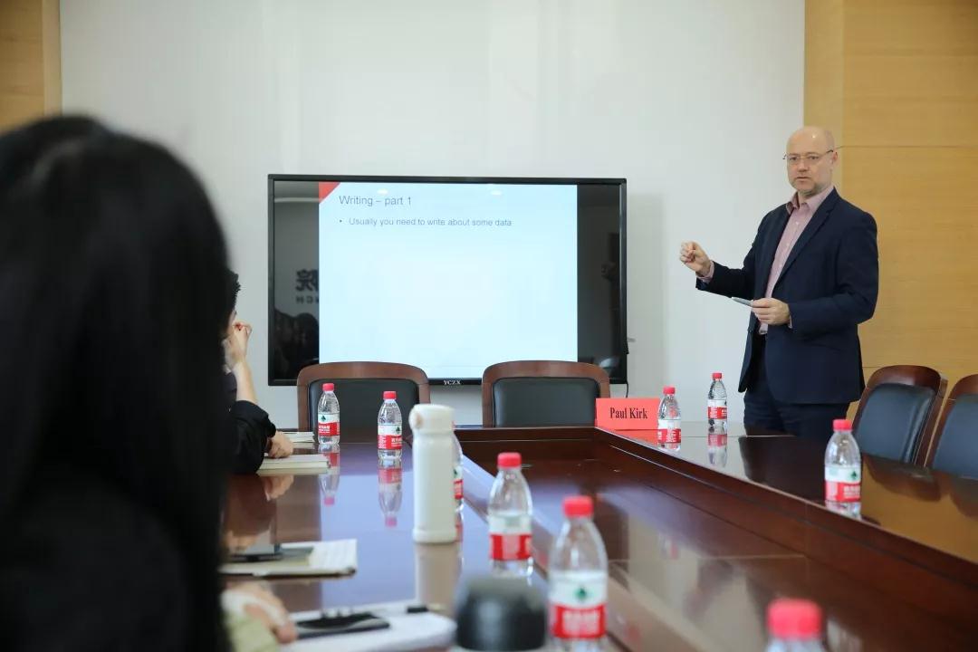 上午11点钟,密德萨斯大学代表团来到跨贸基地二楼会议室和商务贸易分院的五名专升硕预科班的学生见面。Paul Kirk 不仅是密德萨斯大学语言及短期课程中心总监兼国际办公室副主任,而且具有28年的丰富英语教学经验。他先后在8个不同的国家工作过,曾任英国剑桥雅思考官、英国剑桥雅思考官培训师,具有丰富的剑桥雅思教学经验和测评经验。Paul Kirk给商务贸易分院预科班的学员们做了一个多小时的专题讲座,分享宝贵的应考经验,鼓励同学们努力学习、早日通过雅思考试、顺利留学英国,并亲切地回答了学生们提出的相关问题。