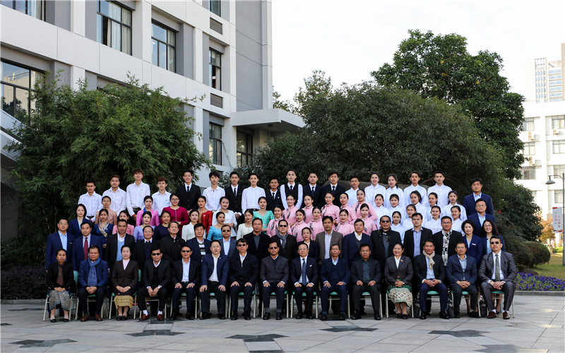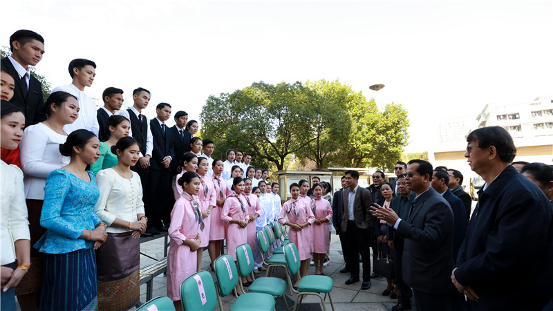 考察团一行一下车就受到育英师生热烈欢迎,他们欣赏了老挝留学生表演的老挝民族歌舞、中国歌舞、中国传统文化及职业技能展示等节目,对老挝留学生的成长进步表示高度赞赏。贡通·蓬维吉对老挝留学生发表讲话,表扬他们在中国只有两年半就可以把中文说得这么好,觉得非常惊讶,说他们真的很棒,希望他们在未来的日子里继续努力学习,把优秀的中国文化带回老挝,毕业后为中老两国的发展做贡献。贡通·蓬维吉一行还欣然与全体老挝留学生合影留念。