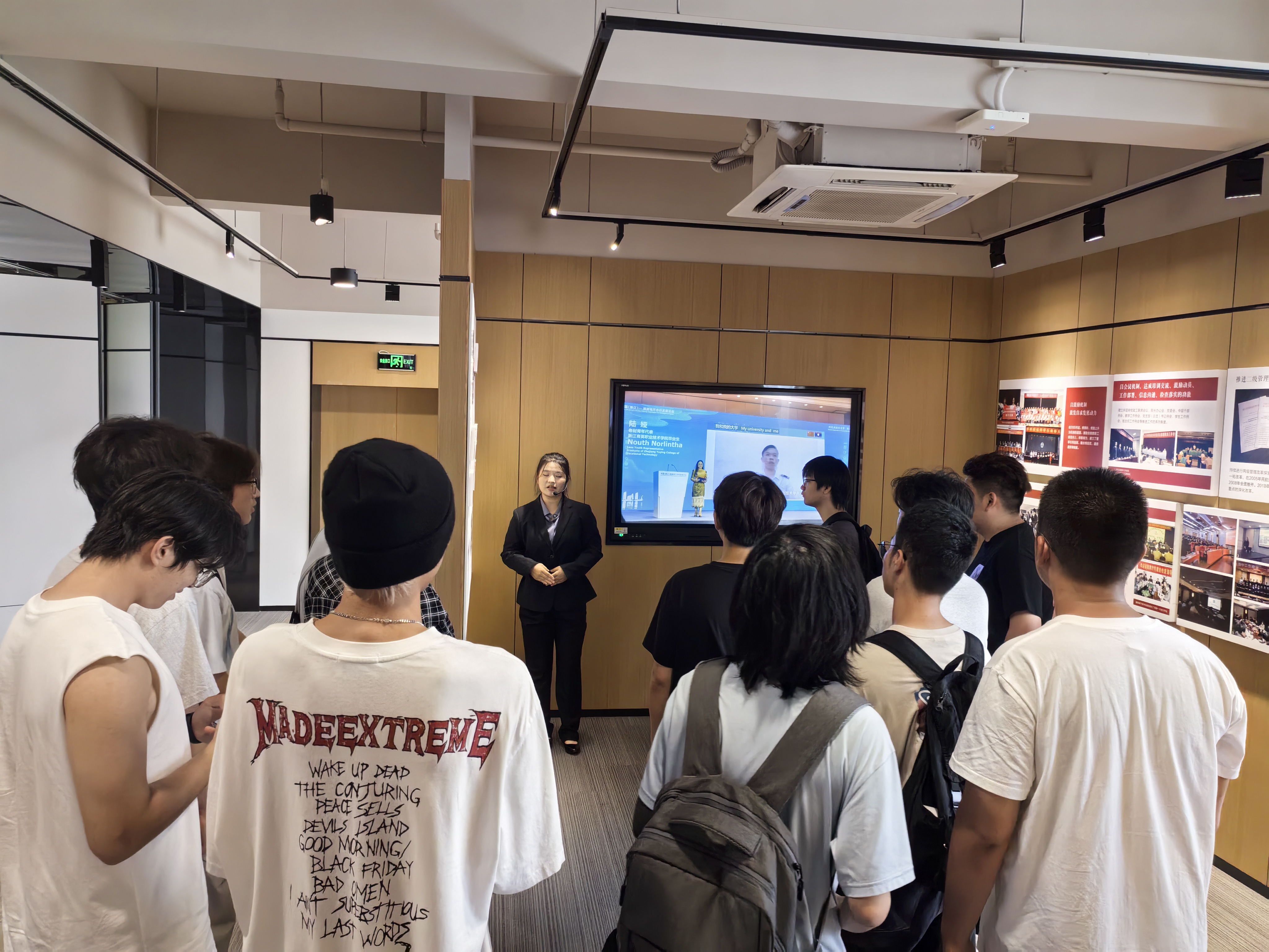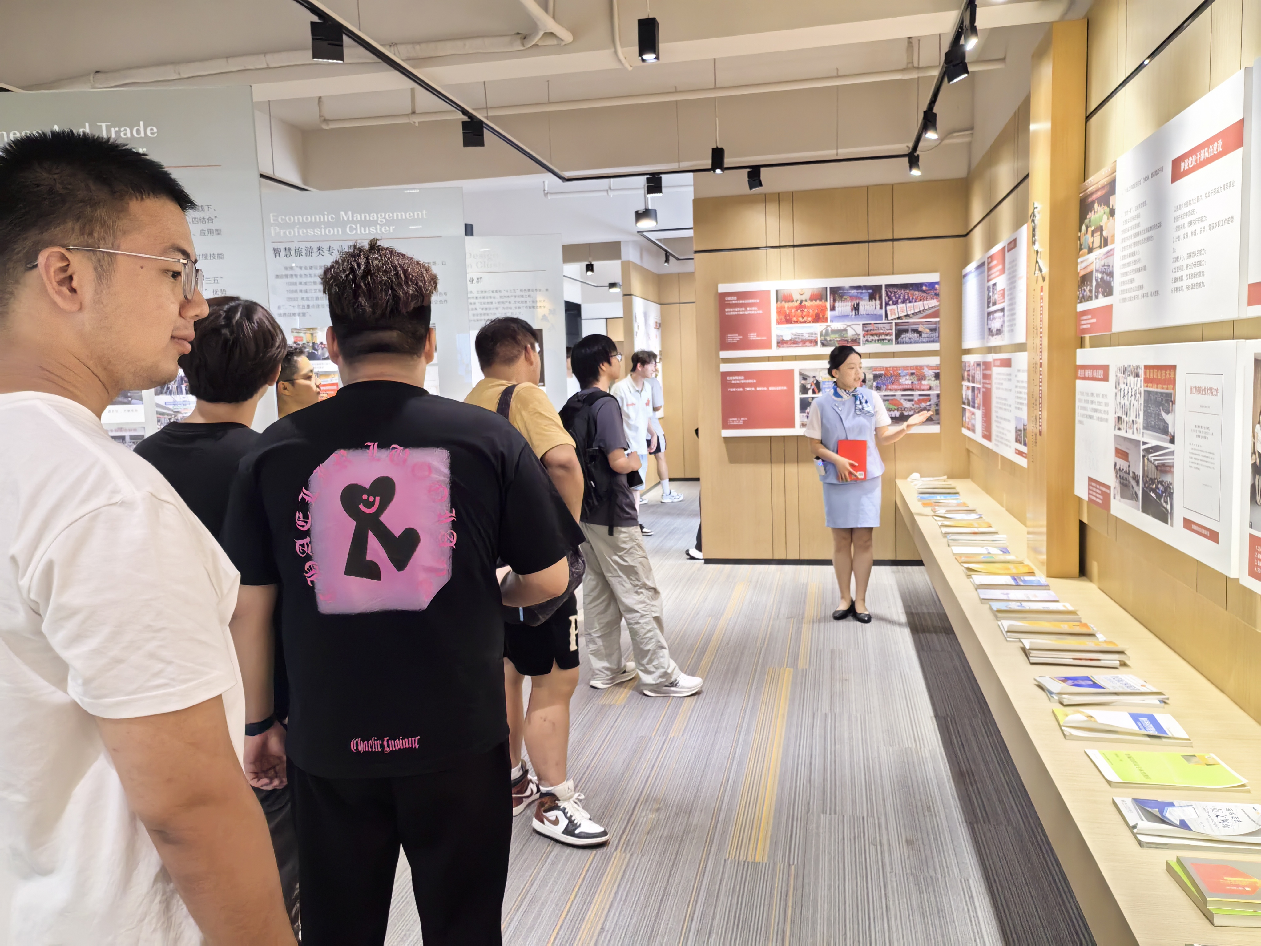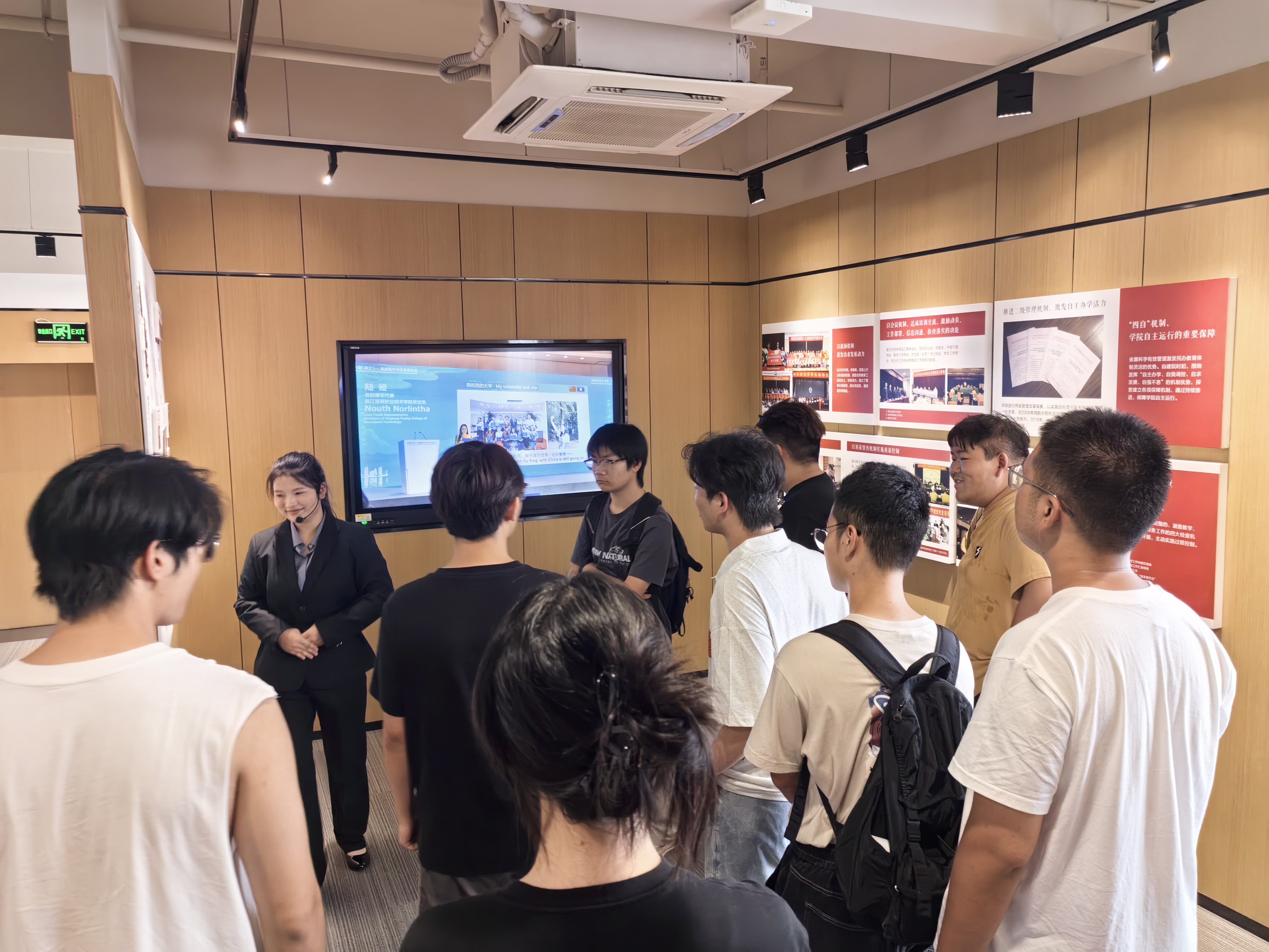 在专业解说员的热情迎接与引导下,同学们保持着良好的秩序,安静有序地步入展厅。展馆内,承载着岁月记忆的照片和实物展品,无声却有力地诉说着浙江育英职业技术学院的奋斗故事 —— 从建校初期的艰难探索,到专业体系的逐步完善;从教学模式的创新突破,到为社会培养大批技能人才的卓越成果,每一个展区、每一段讲解,都将学校的发展历程清晰地铺展在同学们眼前。解说员以生动详实的语言,为同学们细致讲解了学校在不同历史阶段的办学理念、重大事件与突出成就,尤其强调了学校始终秉持的 “厚德载物,自强不息” 的精神内核。