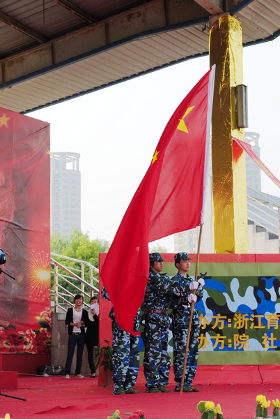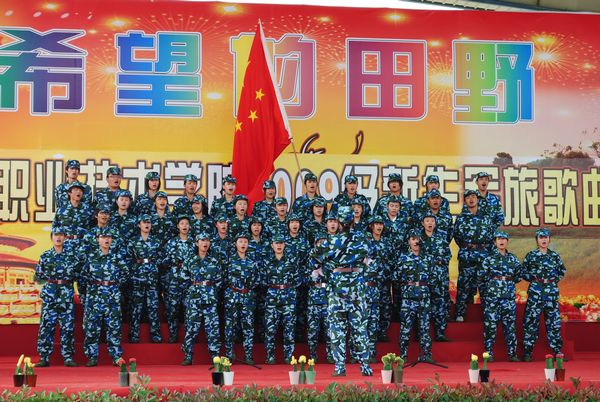 彩旗飘扬,军乐高奏。10月19号下午一点钟,学院田径场上一片绿海,参加军训的全体新生在此举行09年军旅歌曲大赛。