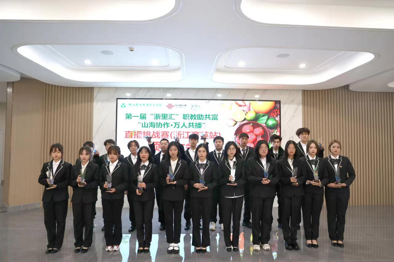 2023年3月24日下午,首届“浙里汇”杯“山海协作·万人共播”直播挑战赛(浙江育英站)颁奖大会在学校一号报告厅举行。浙江省中华职业教育社副主任、浙江省学徒制研究中心主任仉贻泓,校长丁金昌,浙江省学徒制研究中心顾问龚一朋,浙江联通公众客户销售中心副总经理兼杭州联通副总经理赵锡成,杭州联通钱塘区分公司总经理康伟伟,教务部主任罗妮娜,数字商贸学院院长欧阳驹,杭州沸讯品牌有限公司首席执行官曹振出席。数字商贸学院副院长陈贤平主持颁奖仪式。