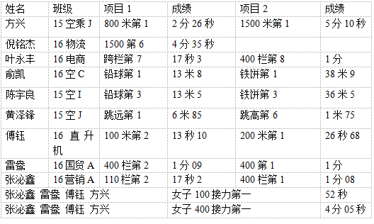 2017年7月15日至20日由中国大学生田径协会举办,鄂尔多斯市政府承办,第十七届全国大学生田径锦标赛在鄂尔多斯市体育中心举行。我院由谢鑫团长,徐晓斌领队,汤剑辉,丁蜜笑为教练。派出10名运动员参赛获得十金二银三铜,女团第一、男团第三、总团第一的成绩。具体获奖成绩如下: