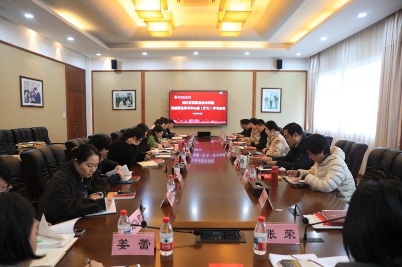12月5日,浙江育英职业技术学院在九楼会议室召开党委理论学习中心组(扩大)会议,专题学习贯彻党的二十届四中全会精神。党委理论学习中心组全体成员,各党总支部、直属党支部副书记,马克思主义学院院长参加会议,校党委书记谢鑫主持会议并作总结讲话。