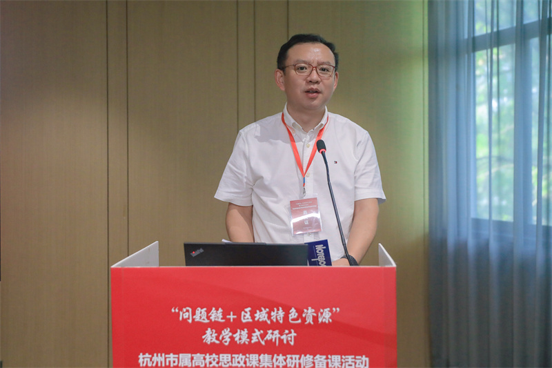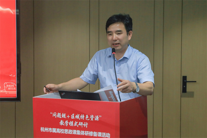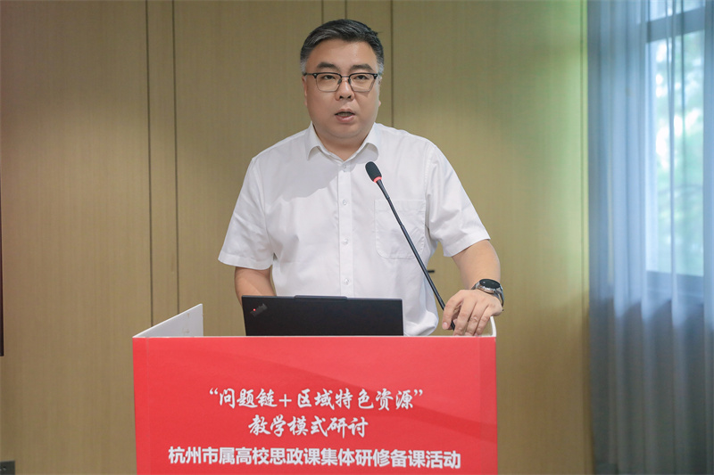 杭州市教育局高等教育处(交流合作处)副处长蔡宇冠在致辞中指出,此次思政课集体研修备课活动是深入学习贯彻习近平总书记重要指示精神、破解教学难题、提升思政课质效的真招实策,是思政教育模式创新的“试验场”、高校协同育人的“连心桥”与教师专业成长的“加油站”,能让理论教学更接地气、更有温度,为思政课教师队伍建设注入新的动能。他肯定了市属高校思政教育成果,并提出三点期望和要求, 一是以学生为中心,让思政课更有“亲和力”,真正走进学生心里;二是以创新为动力,让思政课教学模式更具“生命力”,让思政课常讲常新、永葆活力;三是以“成果为导向”,让研修价值更显“影响力”,真正实现“一次研修、多方受益、长期赋能”目标。