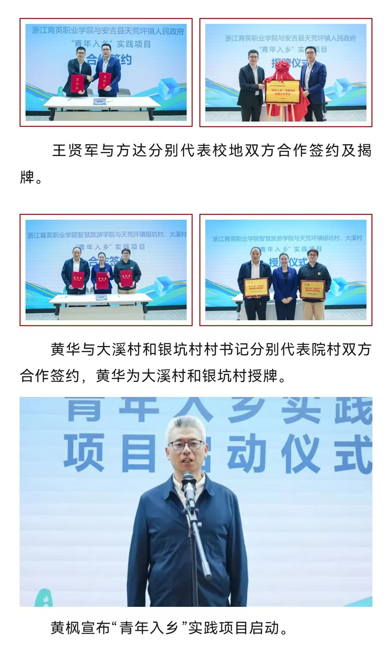 10月29日下午,浙江育英职业技术学院与天荒坪镇“青年入乡”实践项目校地党建共建合作战略签约仪式在安吉天荒坪镇余村青来集举行,双方就进一步搭建校地交流互动平台等合作事项进行商讨。