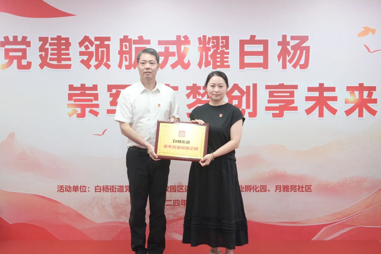 白杨街道人大工委主任徐旭升授予“白杨街道青年创业陪跑空间”牌子。