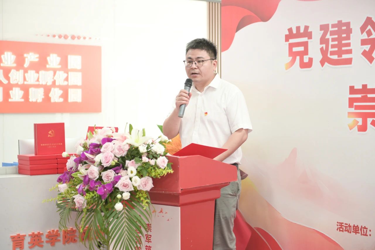 谢鑫致辞。她说,退役军人创新创业党支部的成立,得到了区委区政府的高度重视和大力支持。创梦白杨退役军人创新创业党支部的成立,把党的组织建在了退役军人创新创业的最前沿,是浙江育英职业技术学院和白杨街道在党建引领创新发展方面的一次重要探索和实践。学校基层党组织和园区党支部共建共享,相信在白杨街道党工委和学校党委的关心支持下,园区党支部定能更好地发挥政治引领作用,更多地凝聚党员群众,为园区入驻企业提供最坚强的政治保障和组织保障,实现以“党建红”领航“事业红”,推动园区实现更高质量、更有效率、更可持续的发展,推动各项工作提质增效。
