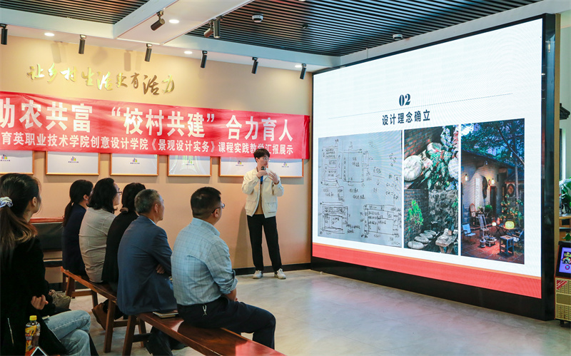 浙江育英职业技术学院创意设计学院环境艺术设计专业学生《景观设计实务》课程汇报会在建德杨村桥镇长宁村党群服务中心举行。学校党委书记、副校长谢鑫,创意设计学院副院长黄汶俊,创意设计学院党总支副书记、院长助理高嘉佳,建德市杨村桥镇党委副书记杨涛,杨村桥镇长宁村党总支书记、主任朱宁斌等听取同学们的课程汇报。