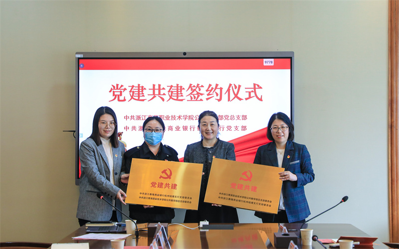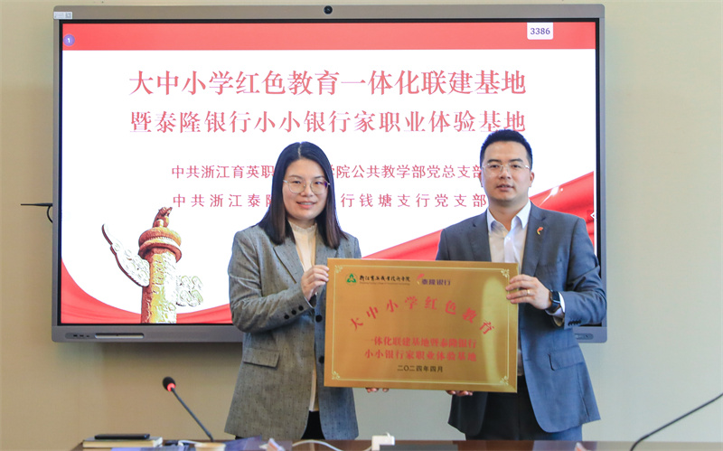 4月2日下午,浙江育英职业技术学院公共教学部、浙江泰隆商业银行钱塘支行、白杨街道云水社区“校企地党建共建暨大中小学红色教育一体化联建基地”签约与揭牌仪式在我校举行。我校党委书记、副校长谢鑫,白杨街道云水社区党支部书记孙桂英,泰隆银行杭州分行党委委员、分行副行长陶丽红及杭州分行钱塘支行行长蒋生火、副行长胡伦娜等,我校党委委员、党群部主任王贤军,公共教学部党总支书记、主任、马克思主义学院院长陈贤平,思政课教师代表出席仪式。公共教学部党总支副书记、副主任谢剑峰主持会议。