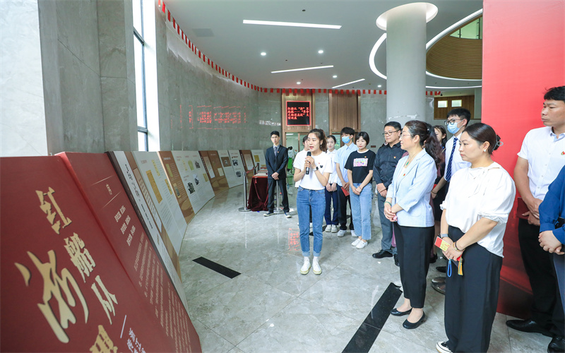 开幕式结束,师生有序进入展厅参观。在巡展现场,参展师生在讲解员的引导下,参观各类展品。一件件革命文物、一张张历史图片、一段段文字描述,跨越时间的长河,生动地将党史呈现在大家面前,展览现场也成了思政教育课堂。